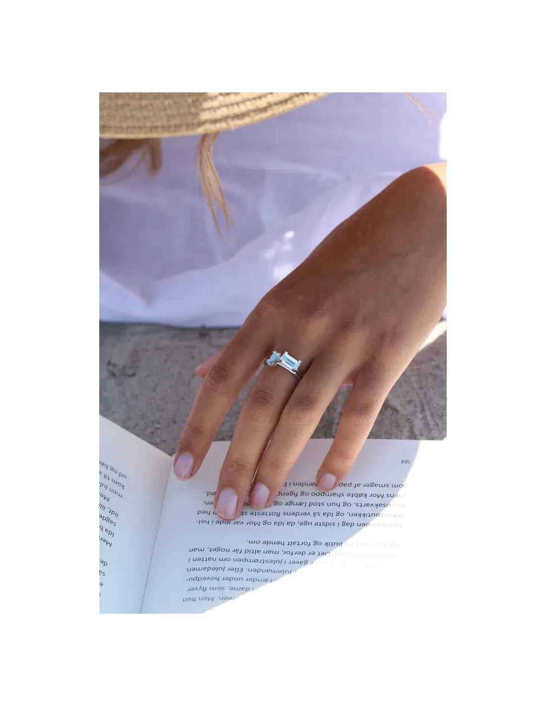 18kt rødguld, diamant og akvamarin Nord Blue-ringen er fremstillet i 18kt rødguld sat med en smuk 0,30ct baguette-sleben akvamarin samt vores Ro signatur-diamant.