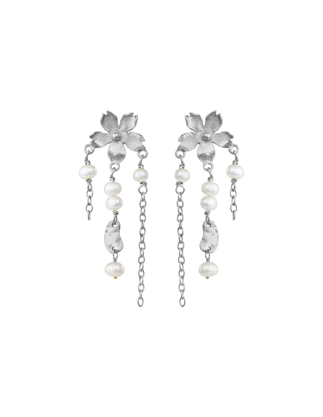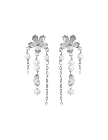 Dingle øreringe, sølv blomst med hvide ferskvandsperler ca. 4.5 cm. Dansk smykkedesign af Susanne Friis Bjørner Copenhagen