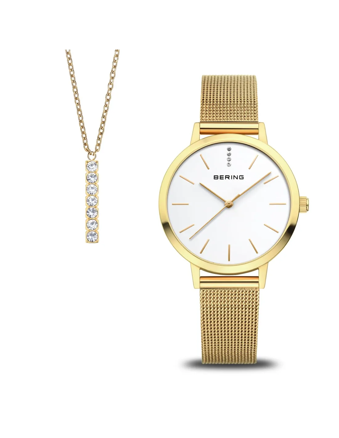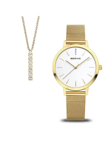 Et sæt, der forener nordisk enkelhed med raffineret elegance: Det minimalistiske dameur fra Classic-kollektionen imponerer med sit rene design, en slank urkasse med fladt safirglas og en finmasket guldfarvet milanéselænke. Komplementeret af en delikat halskæde fra Arctic Symphony-kollektionen – et lodret vedhæng med funklende krystalklar glas. Et stilrent sæt til tidløse øjeblikke.