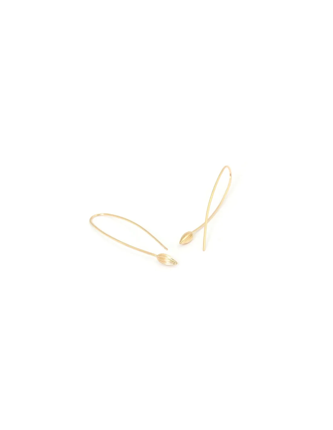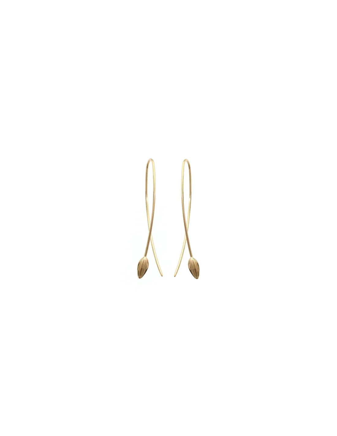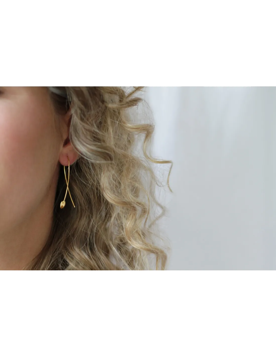 Lange, elegante øreringe fra Linn-kollektionen – inspireret af bevægelige græsstrå. De fine linjer og let buede former giver smykkerne et svævende look, mens de små ører forneden tilføjer et strejf af naturens poesi. Øreringene er lette og behagelige og bevæger sig smukt med dig. Håndlavede i vores værksted i København.