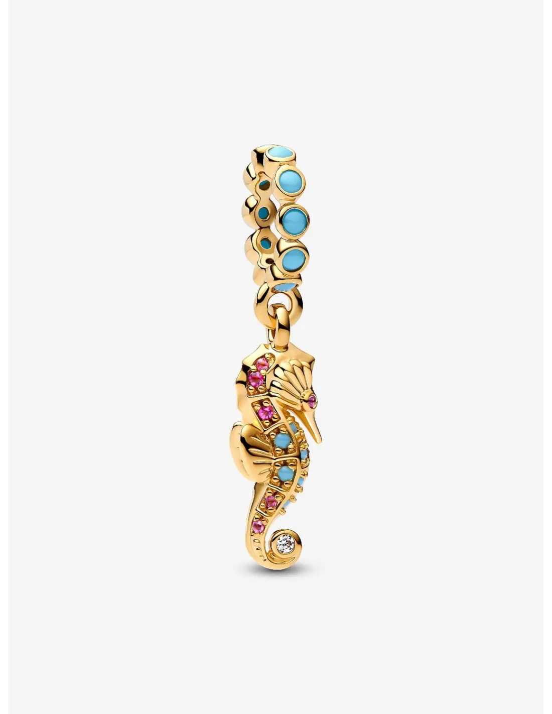 Hyld havets magi med en charmerende søhest, der symboliserer held og blid styrke, fremstillet med klar kubisk zirkonia, capriblå krystal og flokspink krystal.