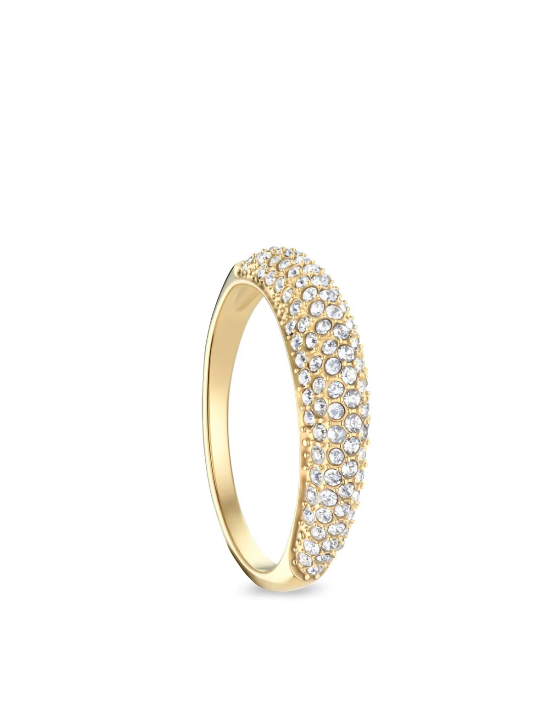 Denne nye ring fra vores Arctic Pavé Collection er en strålende fortolkning af raffineret elegance og imponerende glans. Fremstillet i skinnende guldfarvet rustfrit stål er fronten overdådigt besat med et tæt lag af funklende krystalglassten i pavé-indfatning, hvilket skaber et fortryllende lysspil, der fanger opmærksomheden fra alle vinkler.