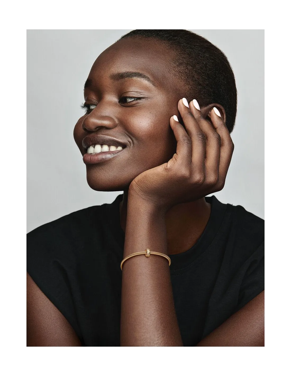 Tilføj endnu mere af den ikoniske tekstur til dit look med dette Pandora klemmeledscharm med tekstur. Dette klemmeledscharm i vores unikke 14 kt. guldbelagte metalblanding har en pyramide og sfærisk kugleformet tekstur, der passer perfekt til dit armbånd, da dets mønster afspejler det nye Pandora-symbol. Charmet har et silikonegreb på indersiden og kan ikke sættes på gevind; derfor bliver det siddende fast på kæden, når du bevæger dig, så du kan sprede dine øvrige charms ud. Skab et camouflageinspireret look ved at sætte det på den nitterede kæde for at give det et dristigt udtryk.