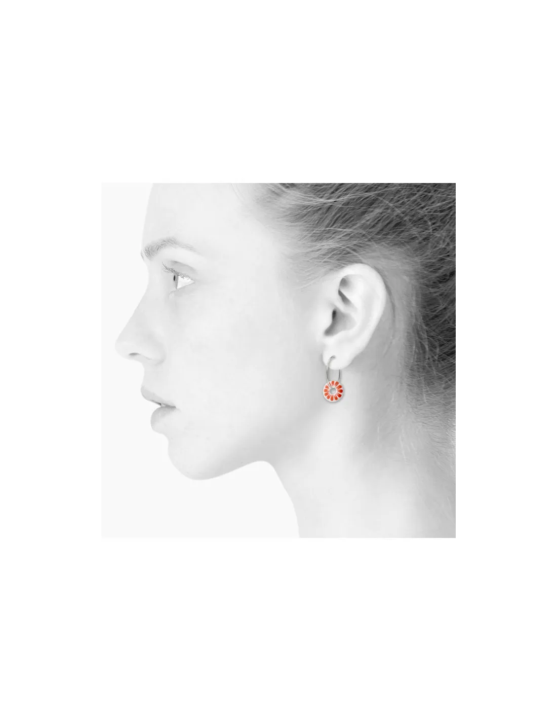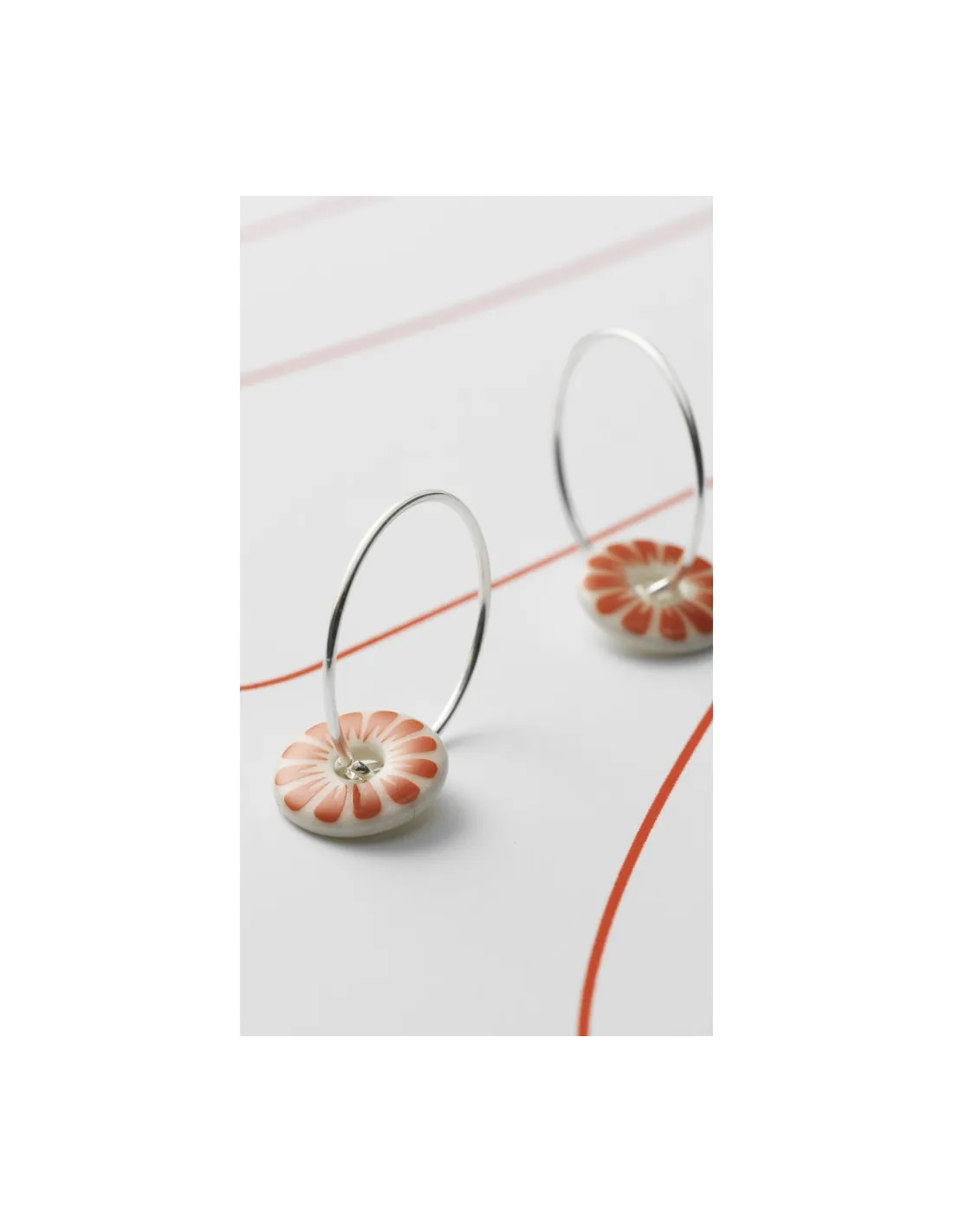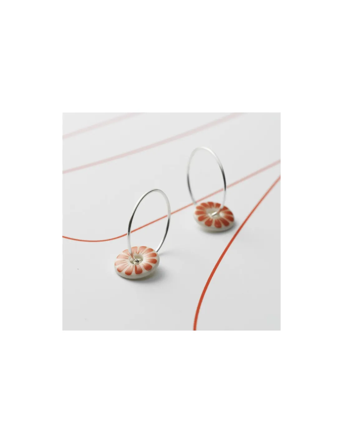 Øreringe med vedhæng af hvid porcelæn med SCHERNING's klassiske BLOOM dekoration i en smuk coral rød.
