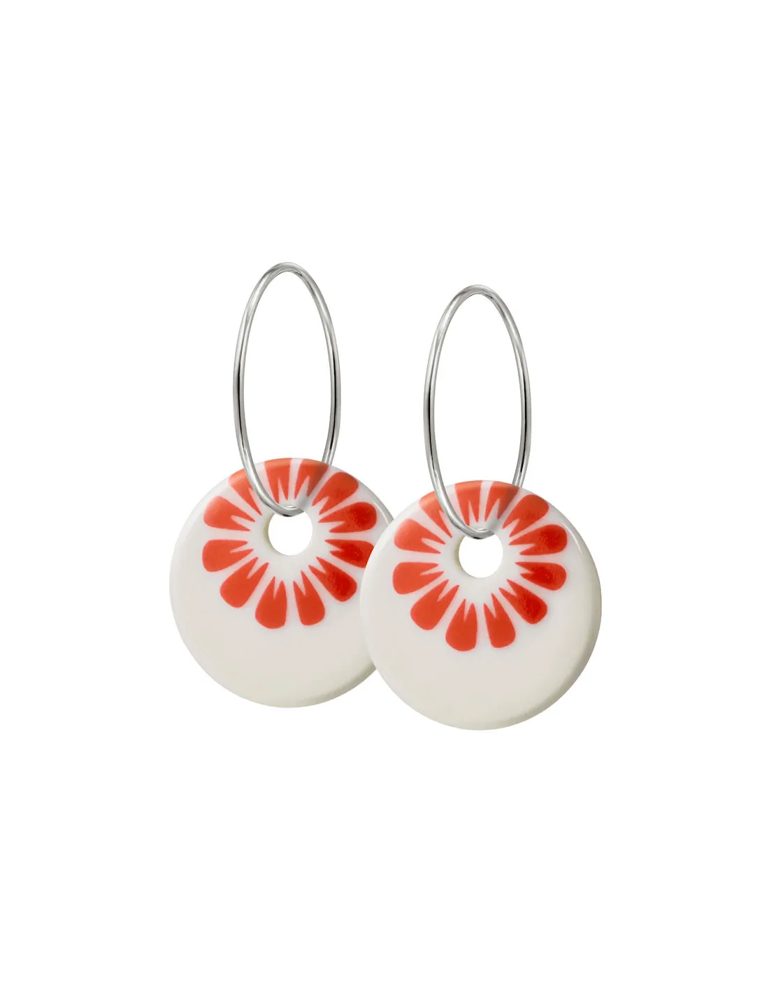 Øreringe med vedhæng af hvid porcelæn med SCHERNING's klassiske BLOOM dekoration i smuk coral rød.