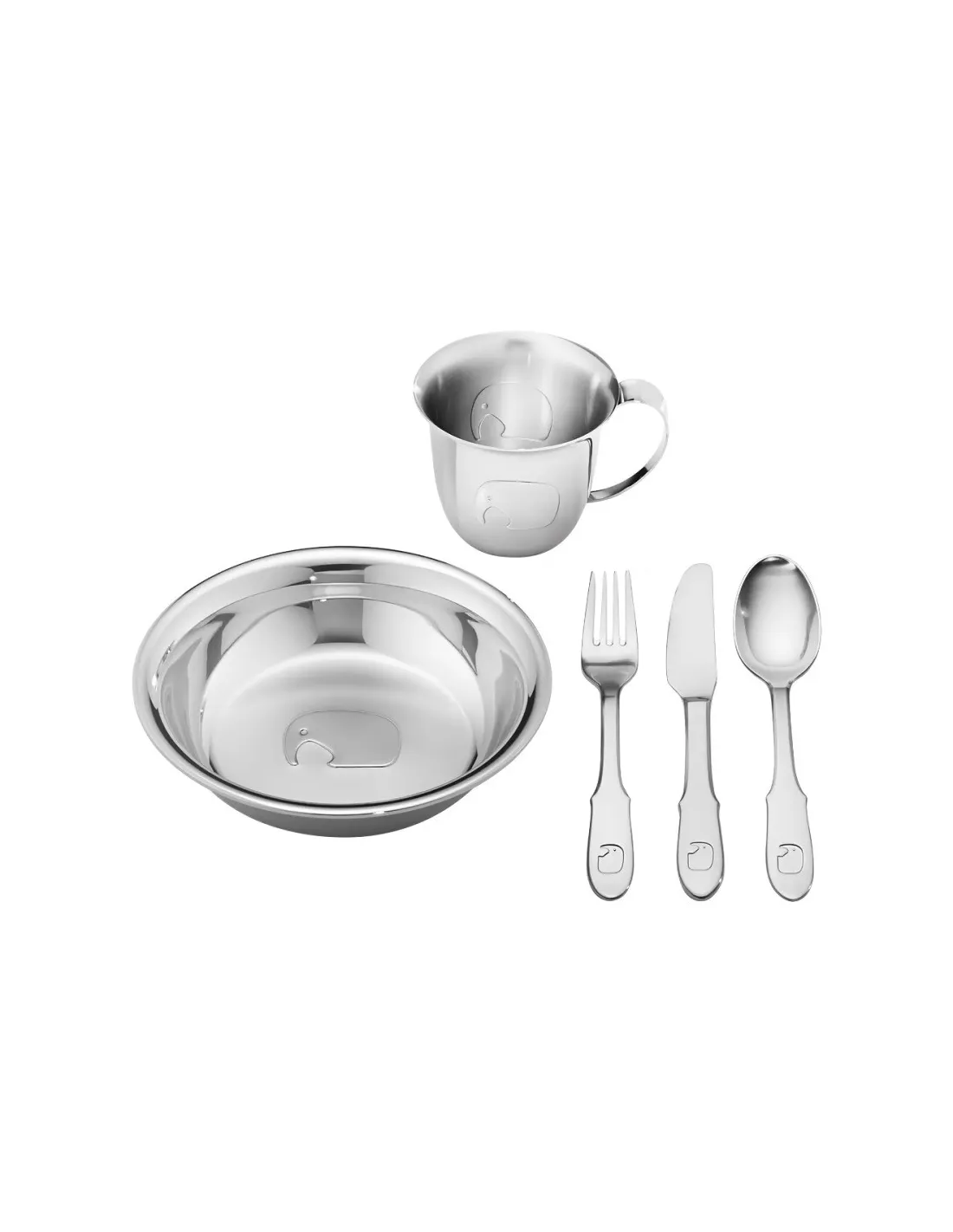 Georg Jensens ikoniske lille elefant har bragt smilet frem ved spisetid hos mange generationer af børn. Ud over kniv, gaffel og ske indeholder sættet med børnebestik en skål og en kop. Det unikke design og det tidsløse look gør børnebestikket til en ideel gave, hvis du skal til barnedåb eller fødselsdag. Bestikket er skabt til at kunne håndtere et par ture på gulvet og gennem luften.