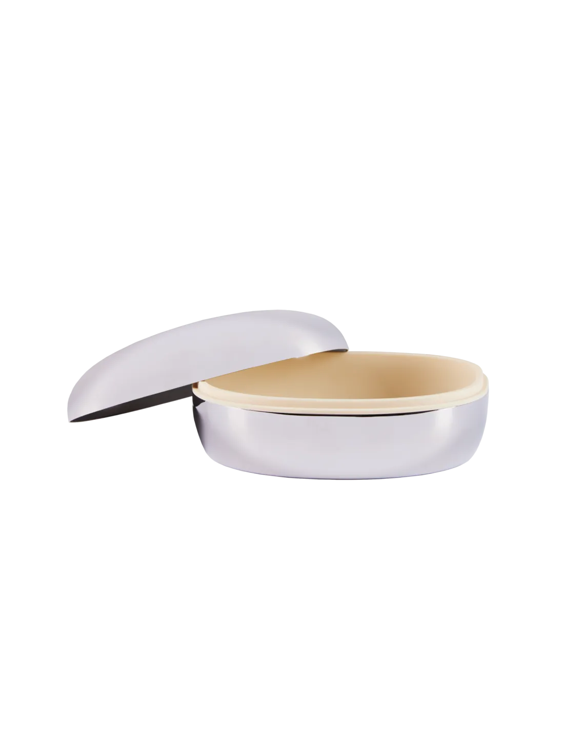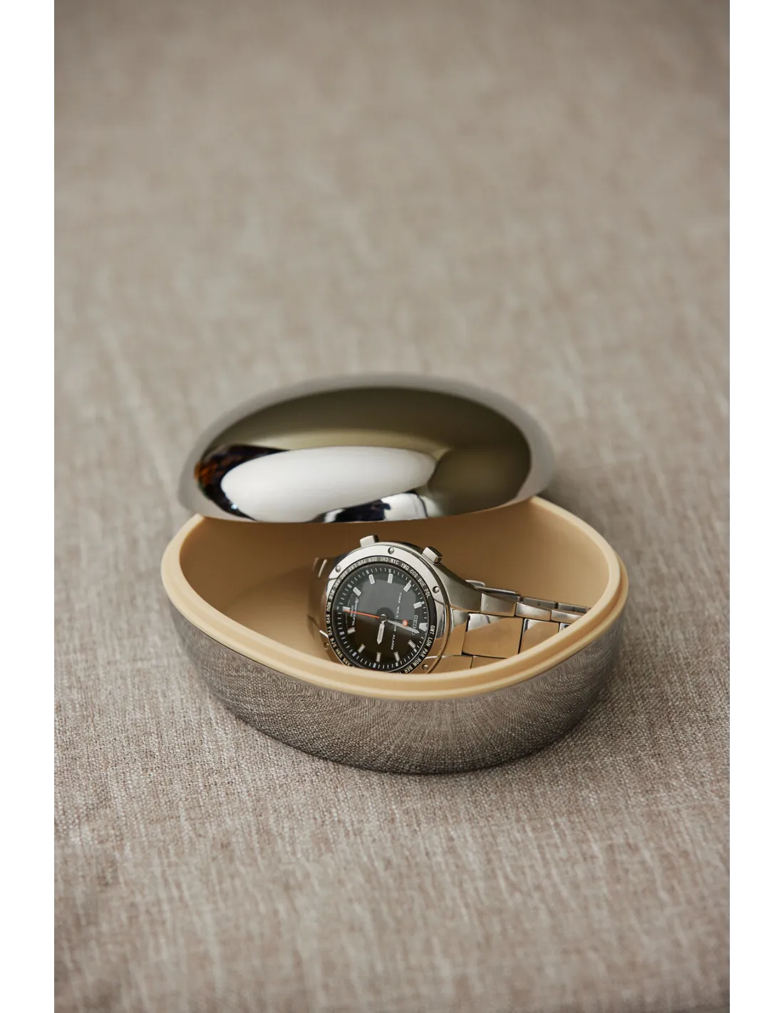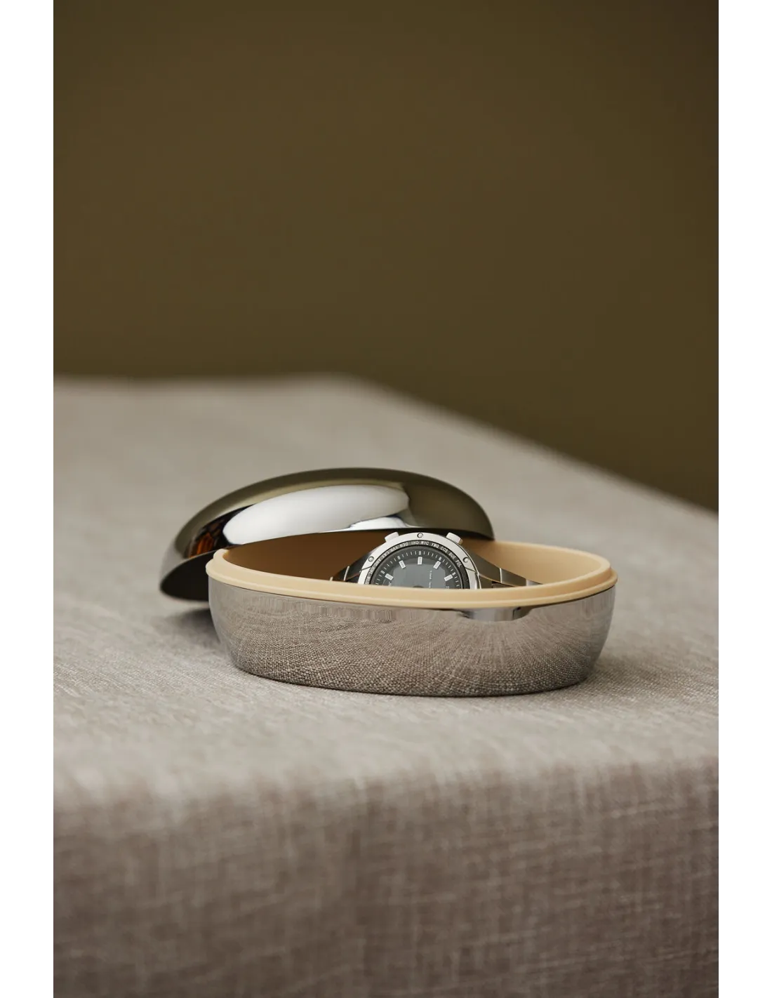 Piet Heins smykkeskrin i rustfrit stål er formet som en elegant superellipse, der forener tidløst design og funktionalitet. Smykkeskrinnets ydre af stål skaber et sofistikeret udtryk, mens det rummelige indre og det bløde indlæg gør det ideelt til opbevaring af smykker. Smykkeskrinet fås i to størrelser og med blank eller børstet overflade. Ideel som gave til særlige lejligheder, med mulighed for gravering af navn og dato.