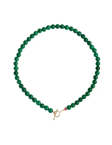 Som en særlig kontrast er der indsat en lille rosa perle tæt ved låsen, hvilket tilfører smykket et unikt og personligt præg. Kombinationen af grøn jade, guldfarvet lukning og den rosa detalje gør halskæden oplagt til både hverdagsbrug og festlige lejligheder.