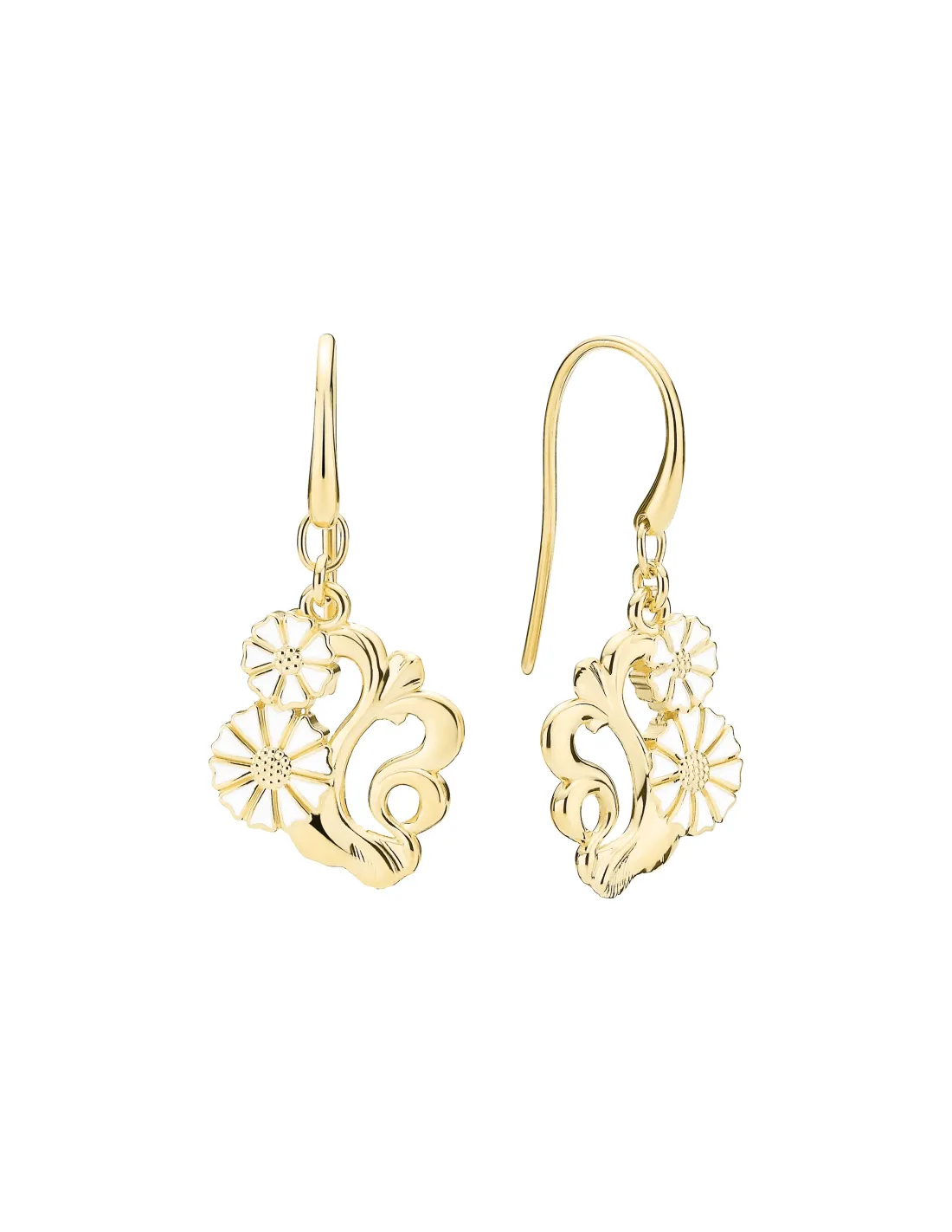 Disse marguerit ørehængere fra Lund Copenhagen er fremstillet i 24 kt. forgyldt sterlingsølv og dekoreret med marguerit-blomster i hvid emalje. Designet kombinerer to margueritter på hhv. 7,5 mm og 5 mm i et elegant filigran mønster, der giver et feminint og let udtryk.