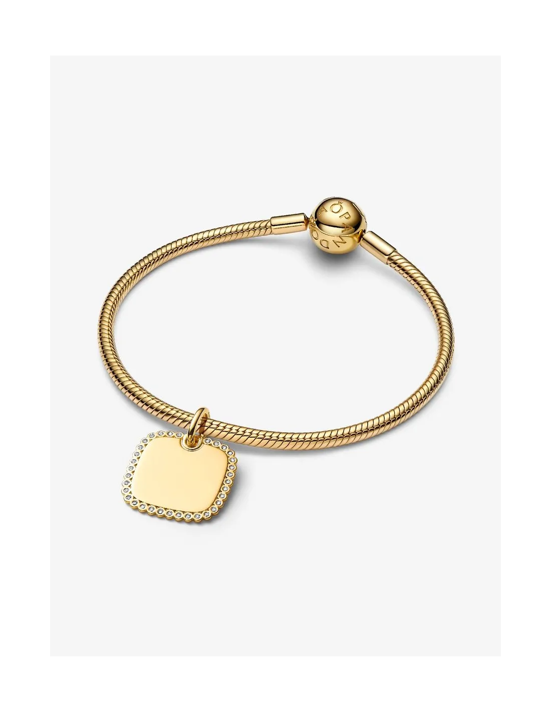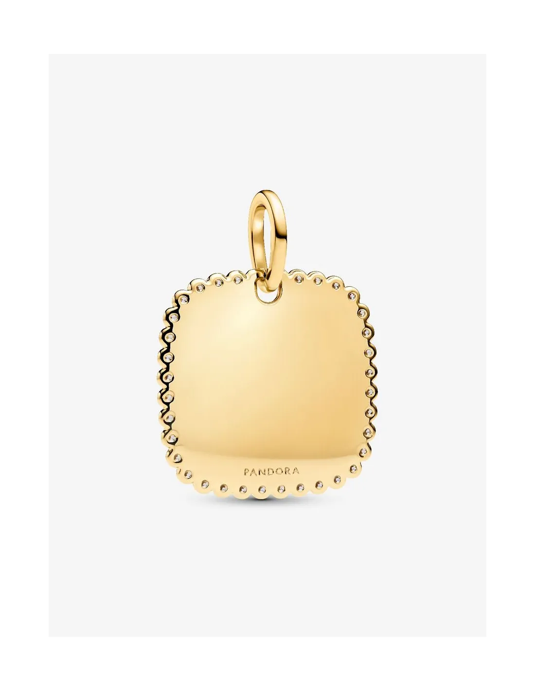 Skab dit eget personlige smykke med dette Pandora vedhæng i guldbelagt sølv. Smykket er designet som en blød kvadratisk plade med spejlblank overflade, omgivet af en ramme af små funklende sten, der giver et luksuriøst udtryk.