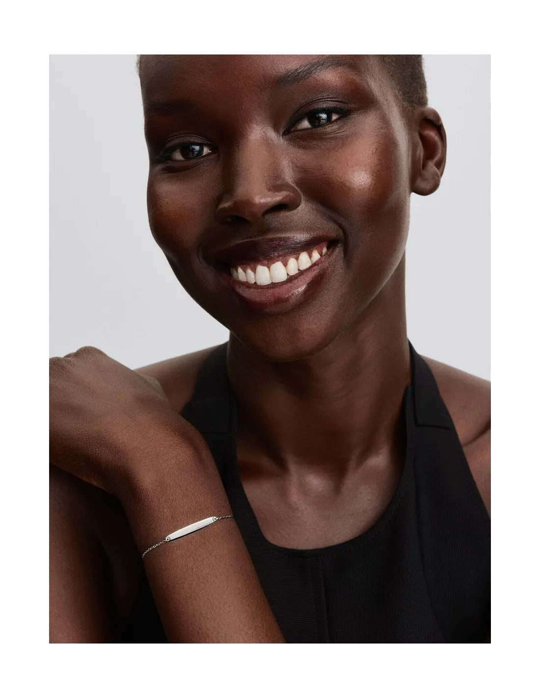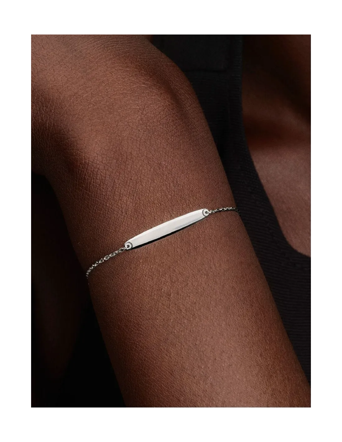 Skab et personligt udtryk med dette Pandora armbånd i 925 sterlingsølv, designet med en slank plade i midten, som kan graveres med navn, dato eller en særlig hilsen.