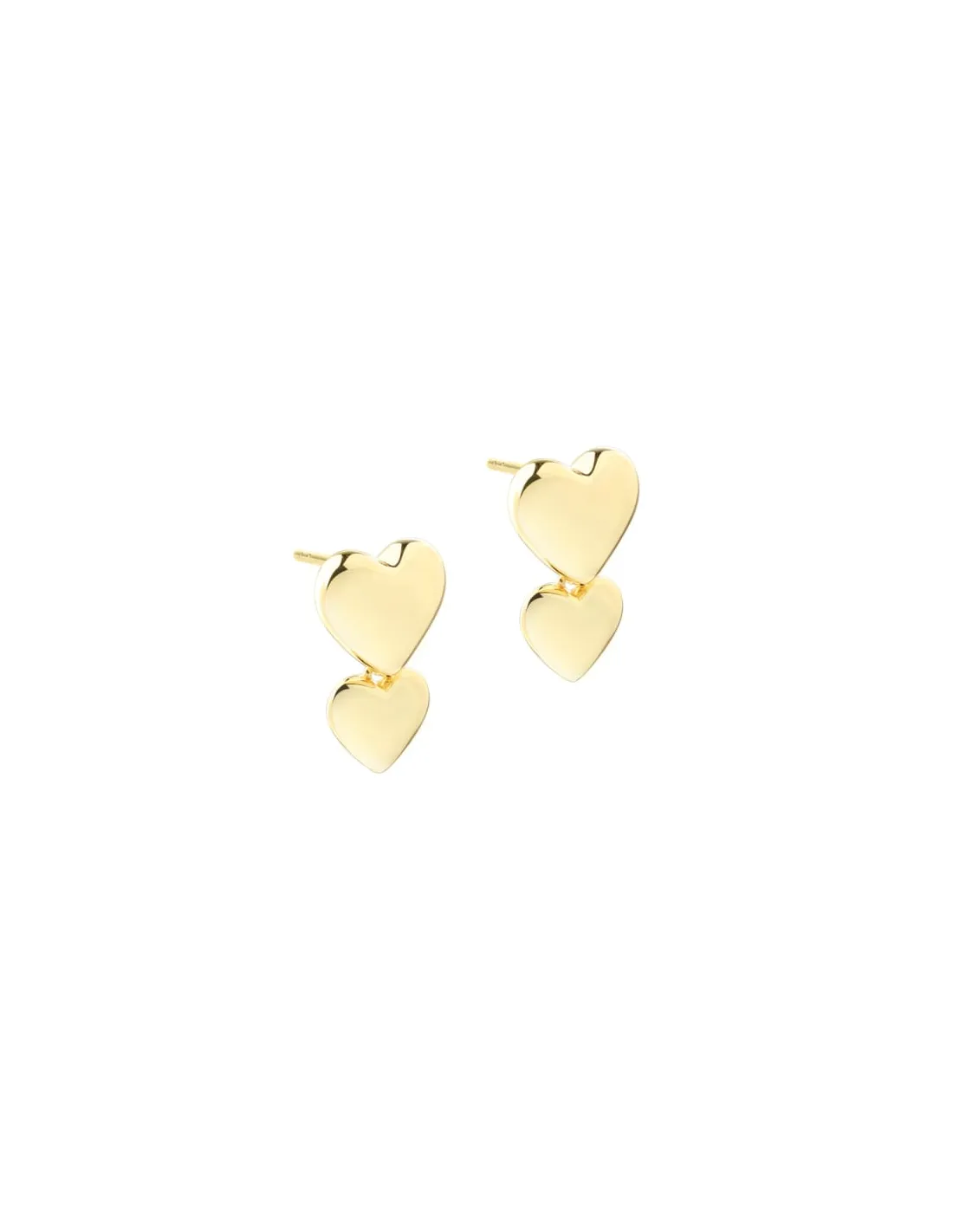 Disse forgyldte ørestikker fra Aqua Dulce er et smykke med både karakter og symbolik. Øreringene består af to blankpolerede hjerter, der sidder i forlængelse af hinanden og skaber et sammenhængende, glansfuldt udtryk.