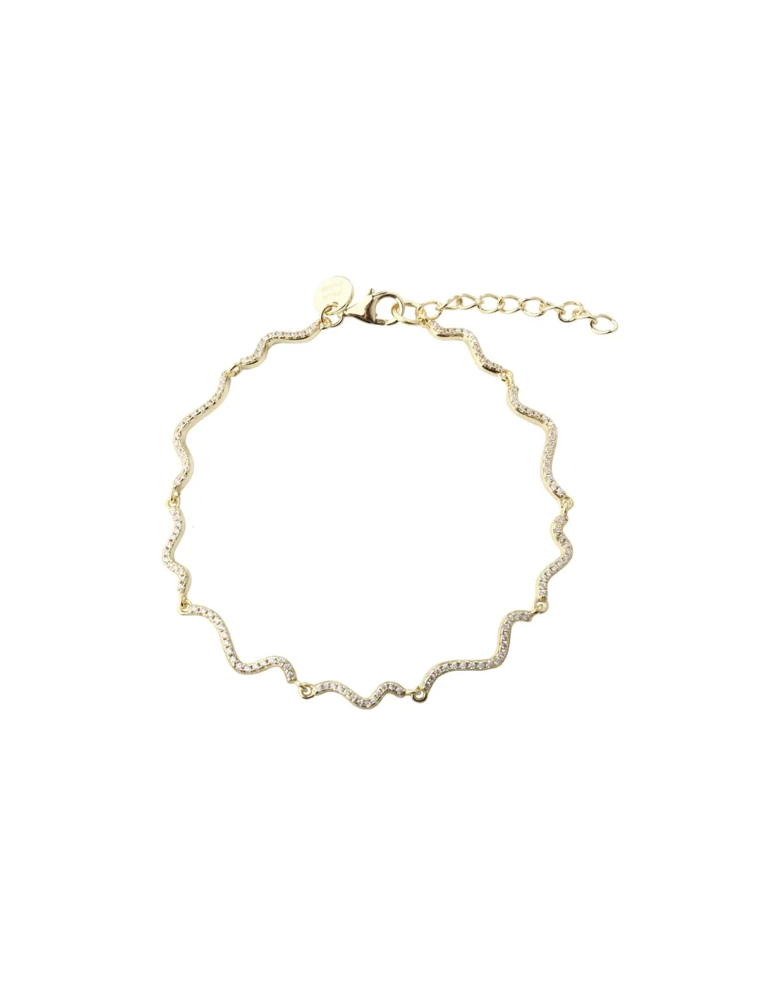 Dette armbånd fra Aqua Dulce kombinerer et organisk bølgende design med funklende zirkonia-sten, der fanger lyset fra alle vinkler. Armbåndet er fremstillet i forgyldt 925 sterling sølv og justerbart i længden, så det passer perfekt til håndleddet.