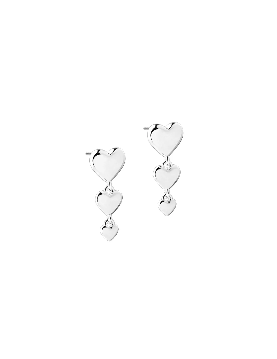 Disse Aqua Dulce sølvøreringe er fremstillet i 925 sterling sølv og designet med tre hjerter, der smukt hænger i forlængelse af hinanden. Kombinationen af blankpoleret sølv og det kærlige hjerte-motiv giver øreringene et feminint og iøjnefaldende udtryk.