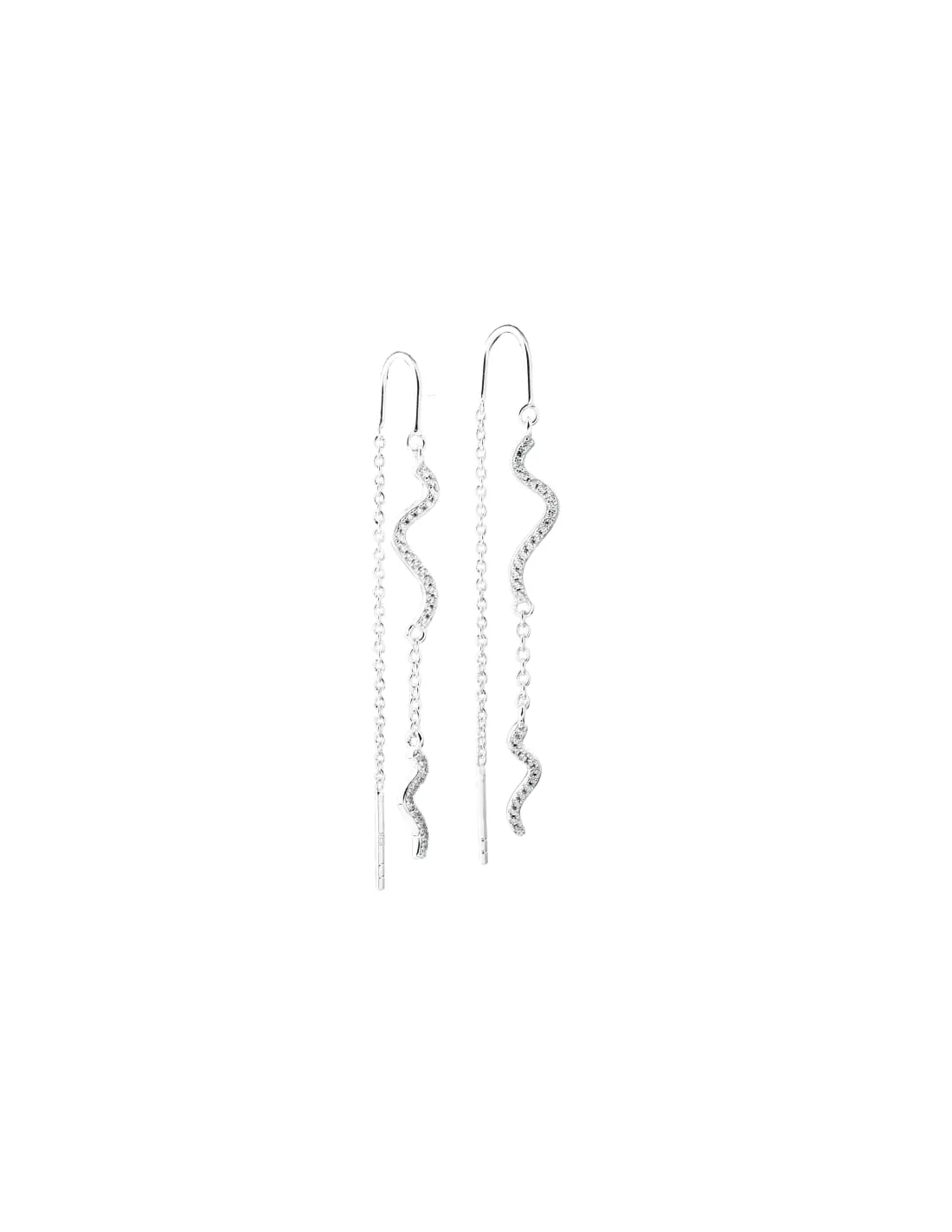 Disse lange sølvøreringe er fremstillet i 925 sterling sølv og prydet med klare zirkoner, der fanger lyset ved hver bevægelse. Det bølgede design giver et moderne og iøjnefaldende udtryk, mens de fine kæder tilføjer lethed og bevægelse.