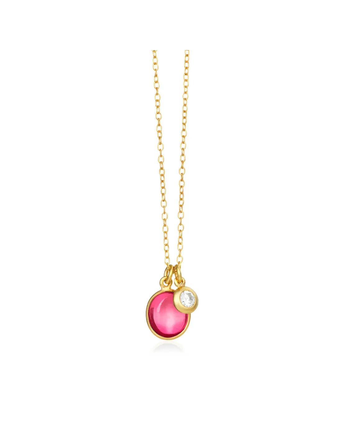 Denne halskæde fra Susanne Friis Bjørner er fremstillet i forgyldt sølv og designet med et unikt vedhæng bestående af en rund pink sten og en klar zirkon. Kombinationen af det gyldne udtryk, den farverige sten og den skinnende zirkon giver smykket et moderne og iøjnefaldende look.