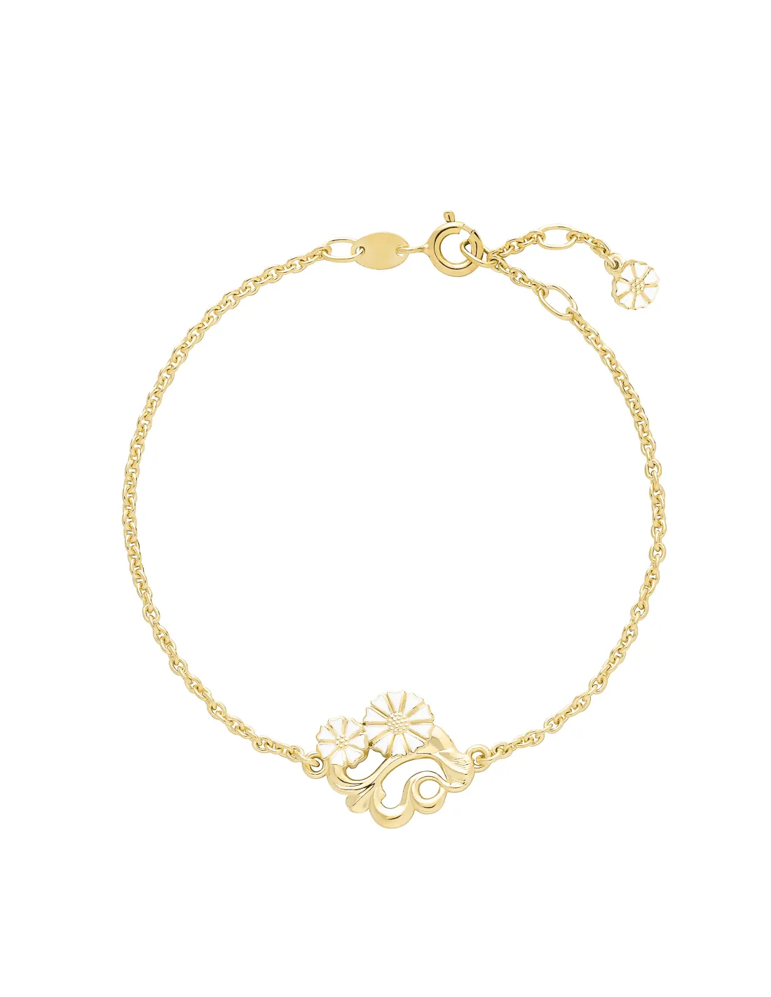 Dette forgyldte armbånd fra Lund Copenhagen er fremstillet i ægte 925 sterling sølv, belagt med guld, og smykket med marguerit-blomster i hvid emalje. Armbåndets feminine design kombinerer klassiske blomsterdetaljer med et gyldent udtryk, hvilket gør det velegnet både til hverdag og festlige lejligheder.