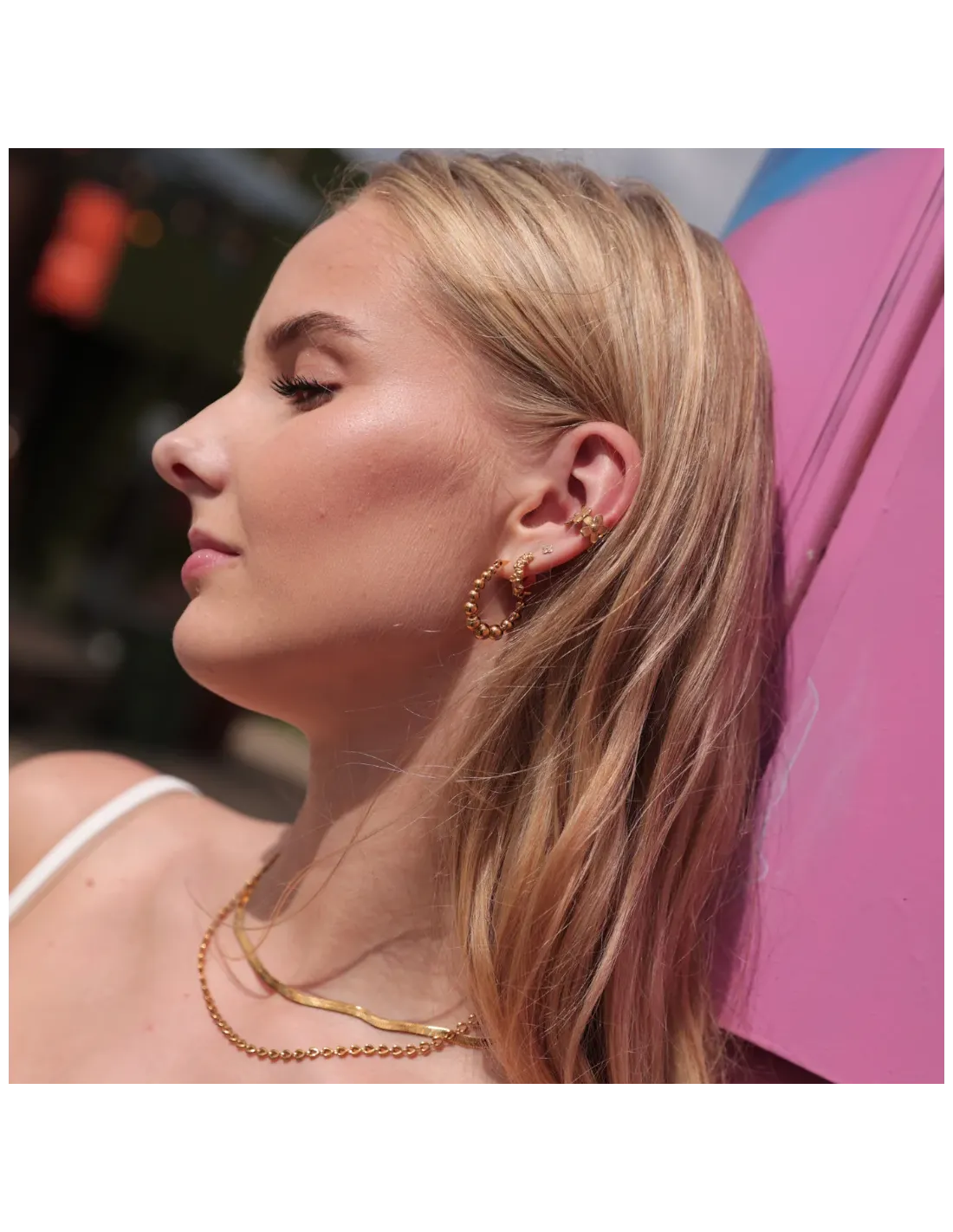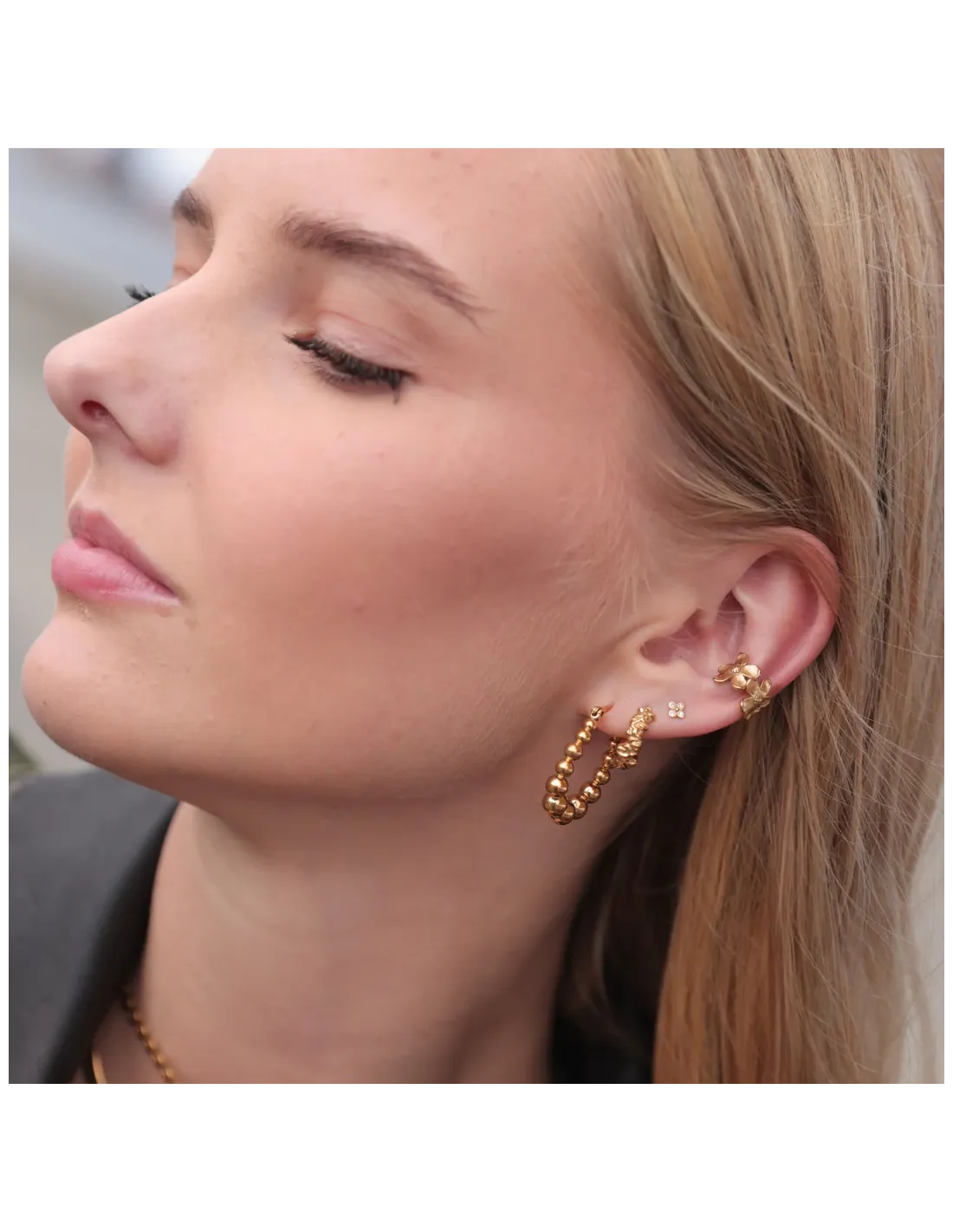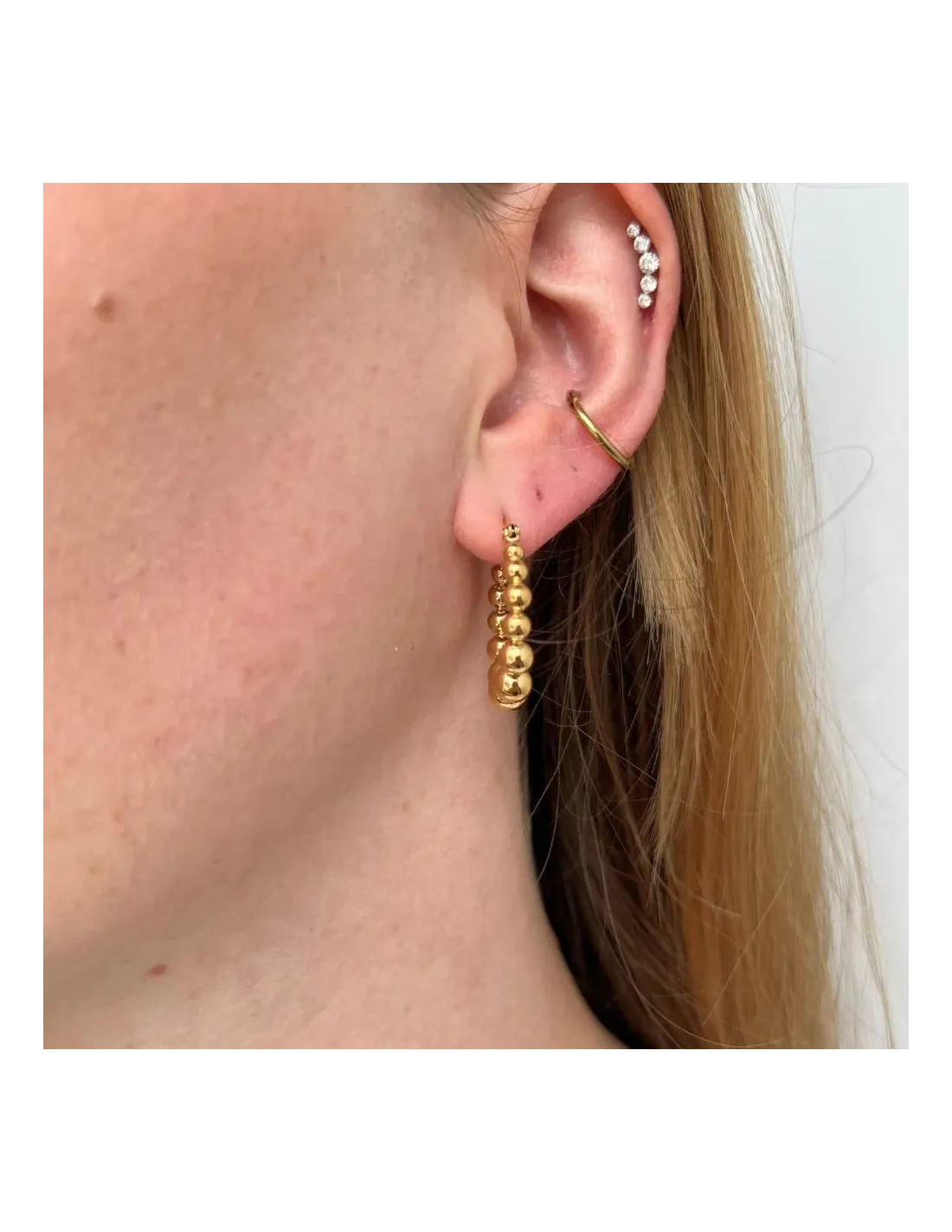 Øreringene har en praktisk kliklås, som gør dem nemme at tage af og på, samtidig med at de sidder sikkert i øret. Perfekte både til hverdagsbrug og festlige lejligheder – og et oplagt valg til dig, der ønsker trendy smykker med et gyldent touch.