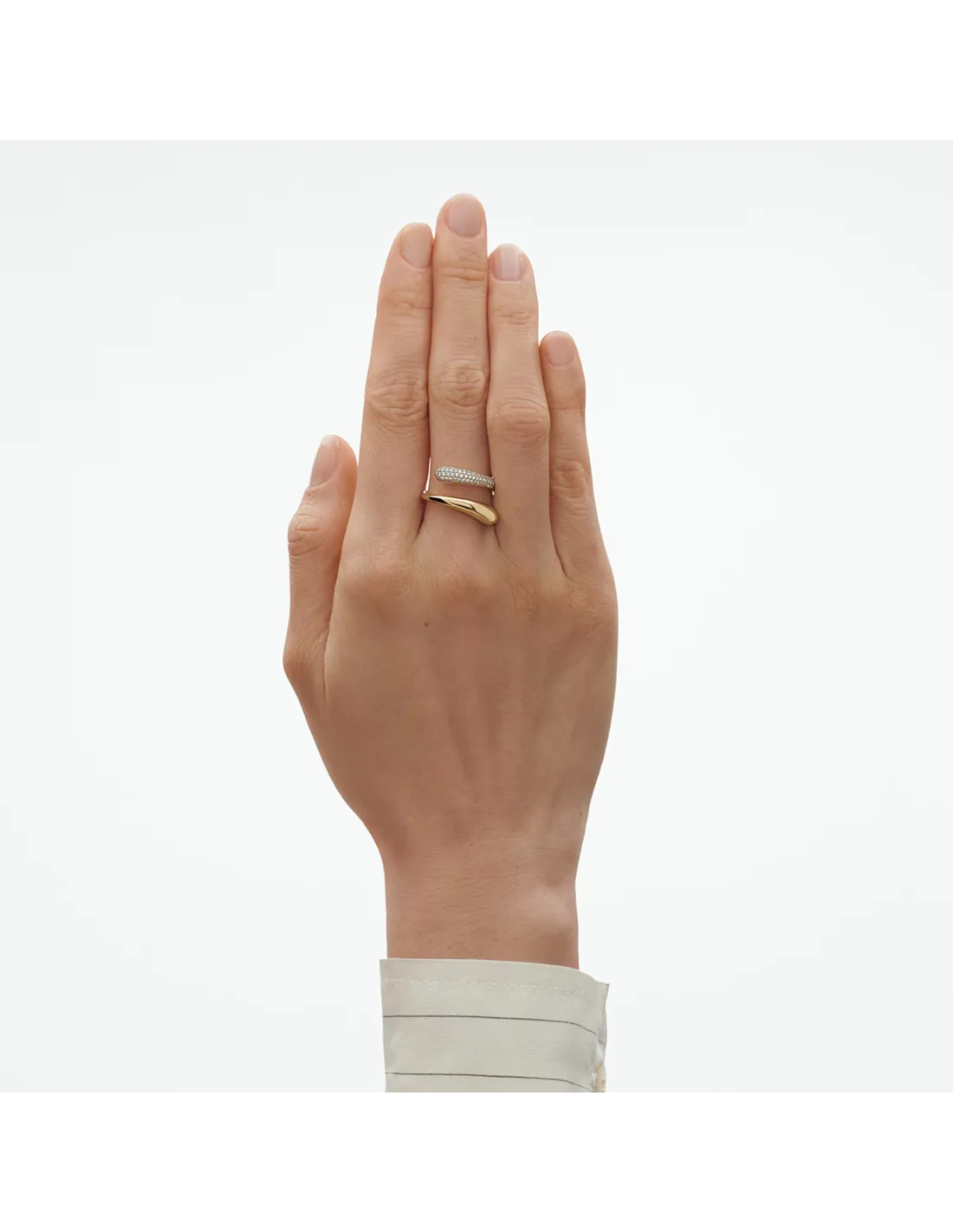 Den ene bue er pavé-sat med funklende hvide diamanter, som tilføjer et strålende spil til ringens bløde former og skaber et eksklusivt og moderne udtryk.