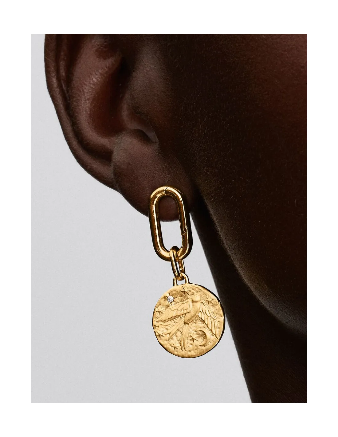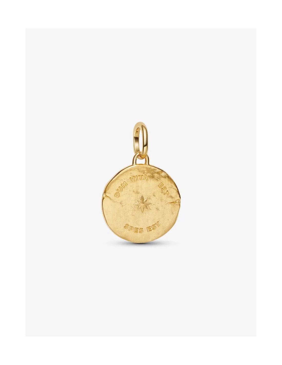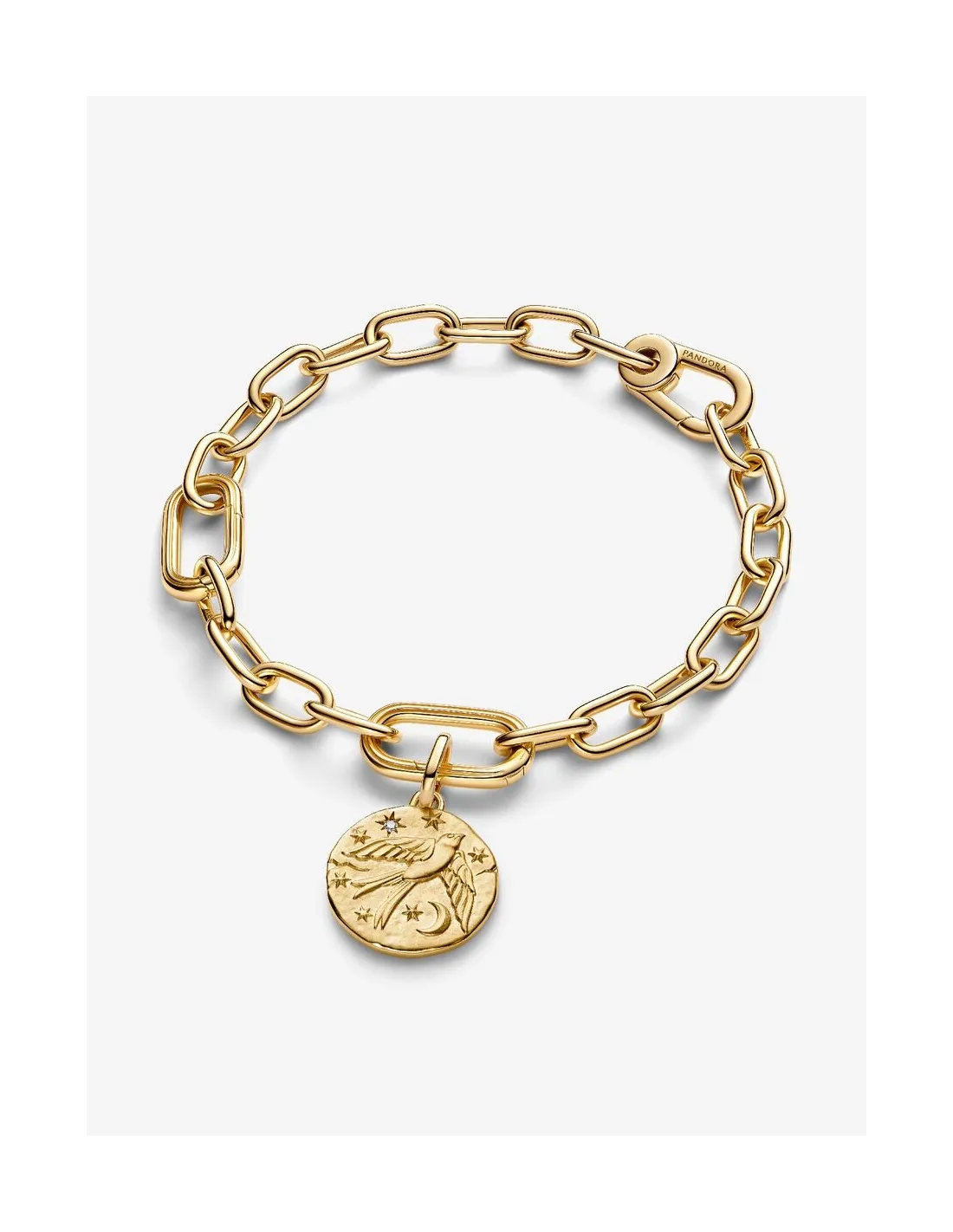Pandora Svale Medaljoncharm i 14 kt. guldbelægning er et elegant og meningsfuldt smykke, der symboliserer håb, frihed og nye begyndelser. Det runde medaljoncharm har en detaljeret gravering af en flyvende svale omgivet af stjerner og måne, der giver et drømmende og spirituelt udtryk.