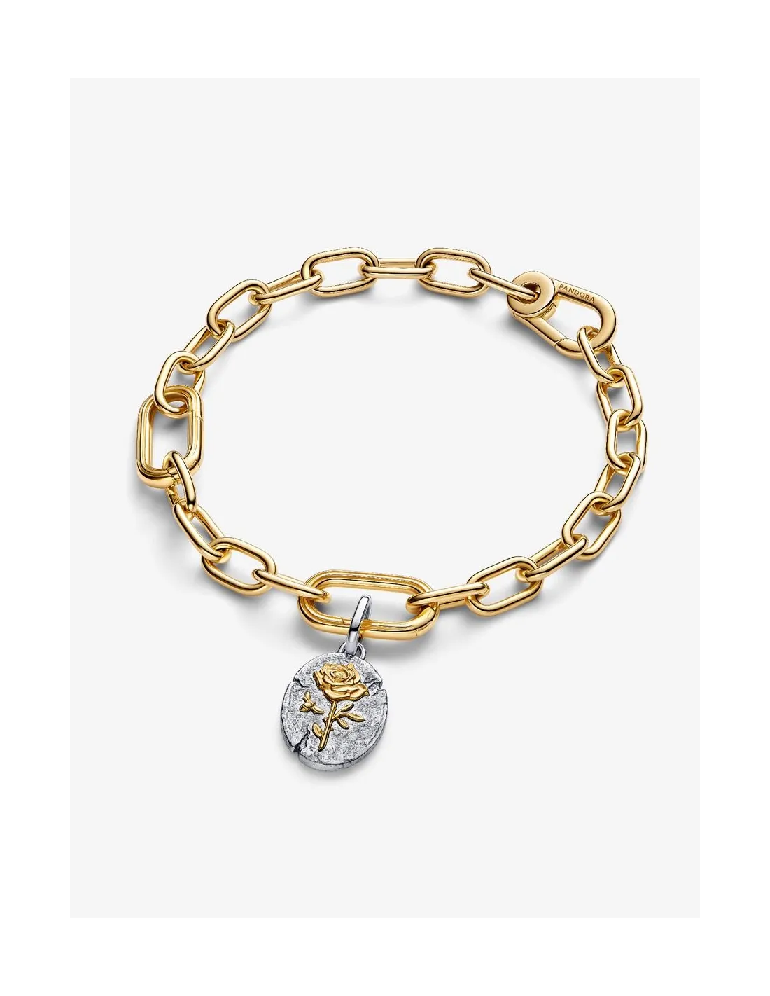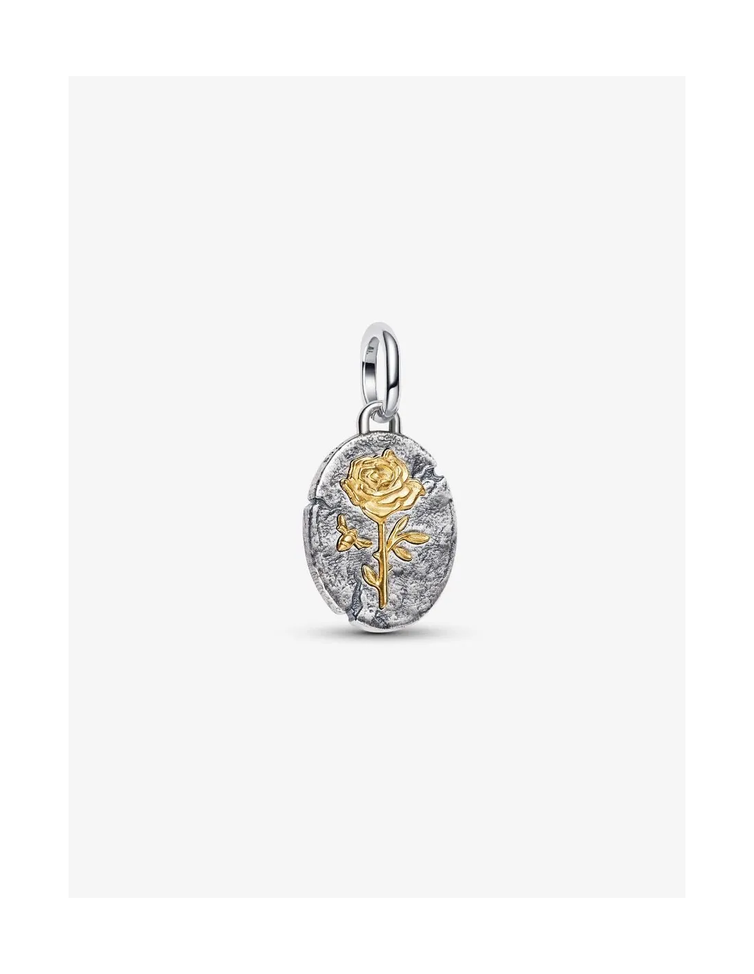 Pandora Rose Medaljoncharm i sterlingsølv med 14 kt. guldbelægning er et romantisk og detaljerigt smykke, der emmer af symbolik. Medaljonen har et rustikt, antik-inspireret udtryk i sterlingsølv, som elegant kontrasteres af den gyldne rose i midten – et klassisk symbol på kærlighed, skønhed og styrke.