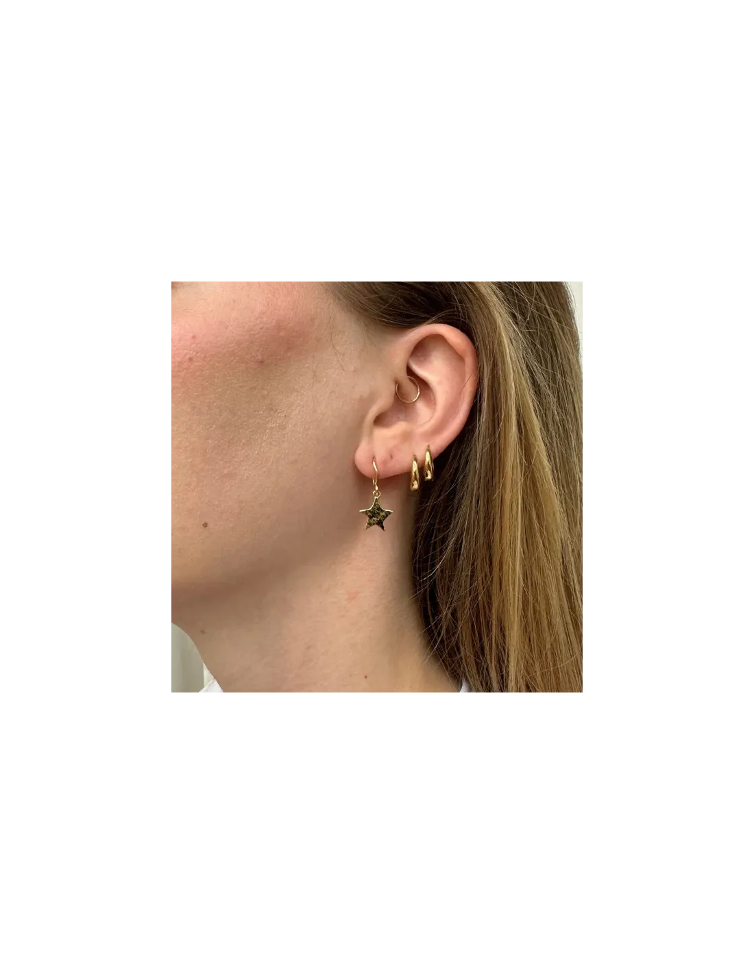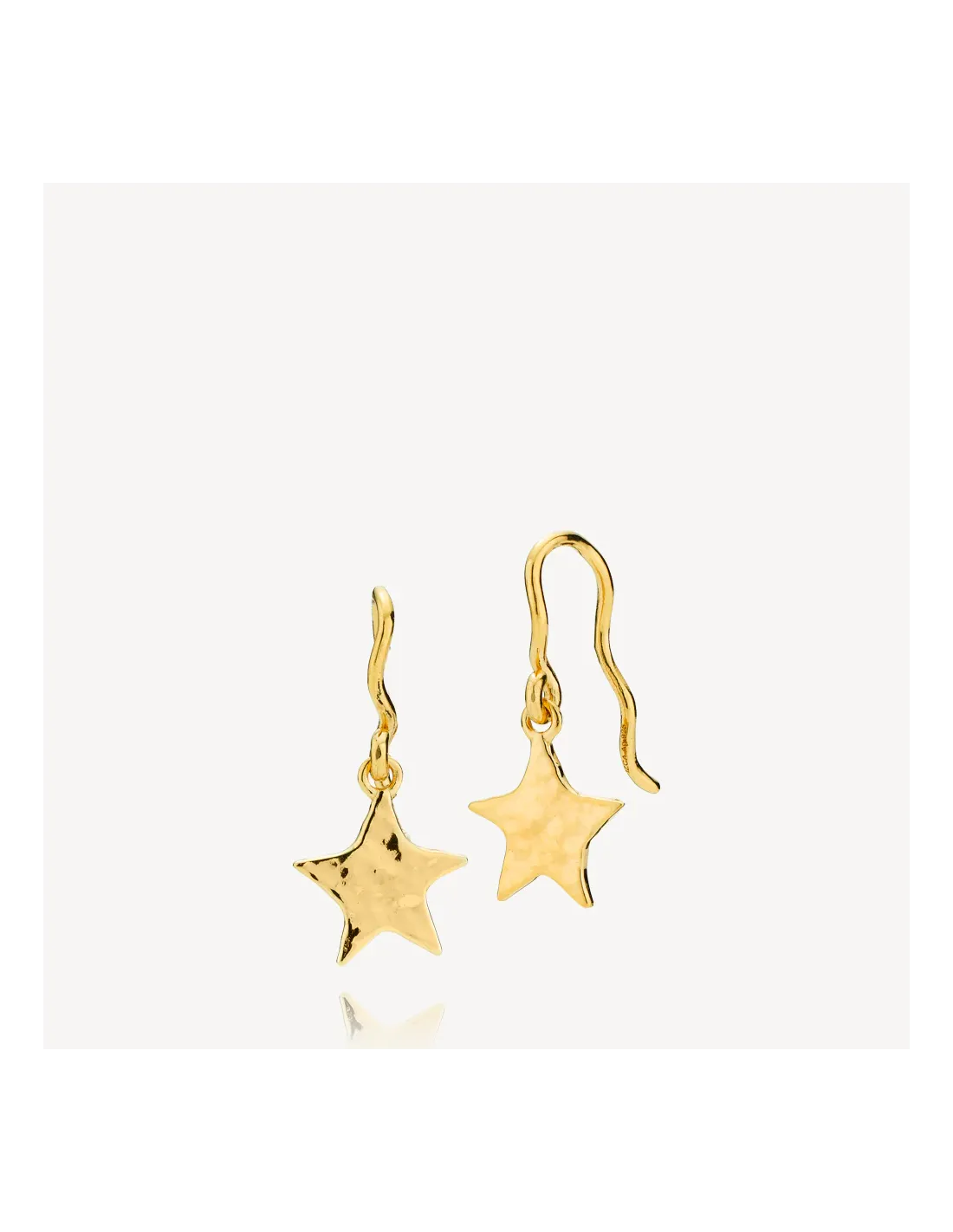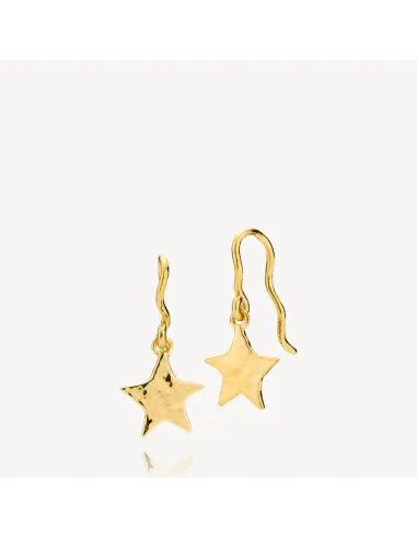 Skyla Øreringe Forgyldt fra Sistie er et par feminine hængeøreringe med krog og et stjerneformet vedhæng. Overfladen har en let hamret struktur, der giver et unikt spil i lyset. Et gyldent smykke, som passer perfekt både til hverdagsbrug og til at pifte festtøjet op.