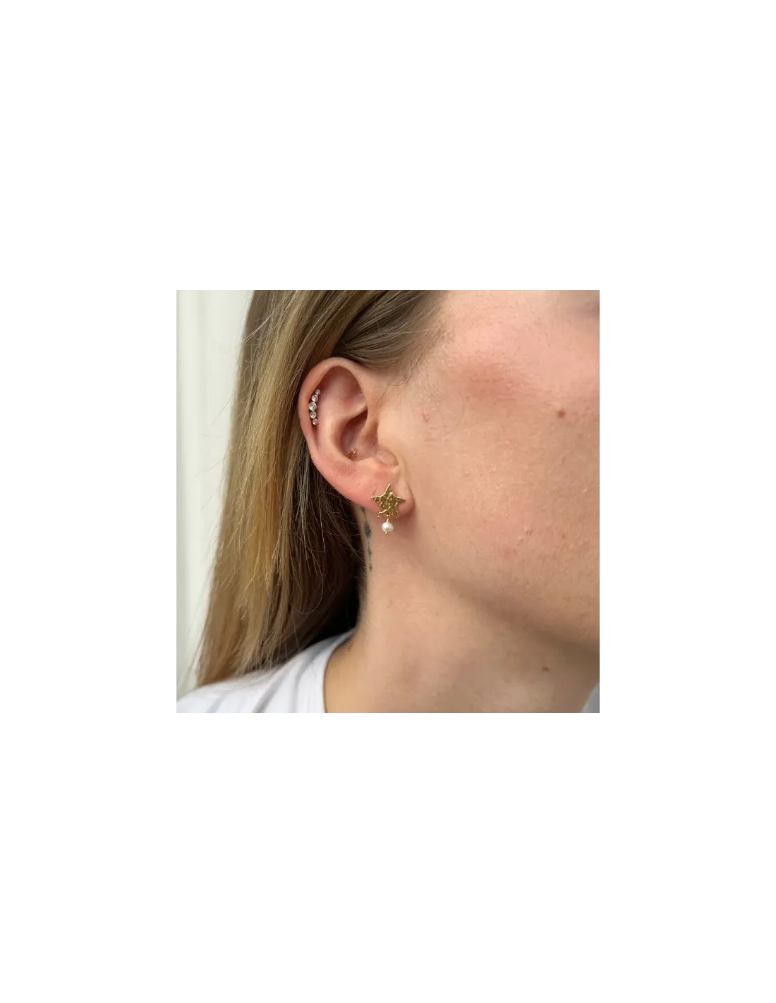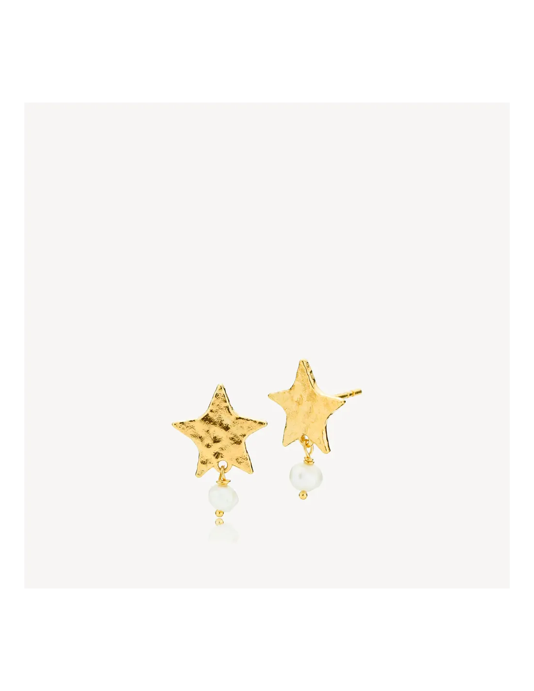 Skyla Øreringe Forgyldt fra Sistie er ørestikker udformet som stjerner med hamret overflade. Under hver stjerne hænger en lille ferskvandsperle, som tilføjer et naturligt og feminint præg. Et smykke, der kan bæres alene for et simpelt look eller kombineres med andre forgyldte smykker.
