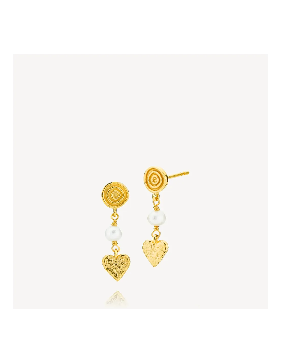Coco Øreringe Forgyldt er et par ørestikker med et romantisk og moderne design. Øreringenes øverste del er udformet som en cirkel med fine detaljer, hvorfra en lille ferskvandsperle hænger. Nederst afsluttes smykket med et hjertevedhæng i forgyldt overflade med en let rå struktur. Et feminint smykke, der kan bruges både til hverdag og særlige lejligheder.