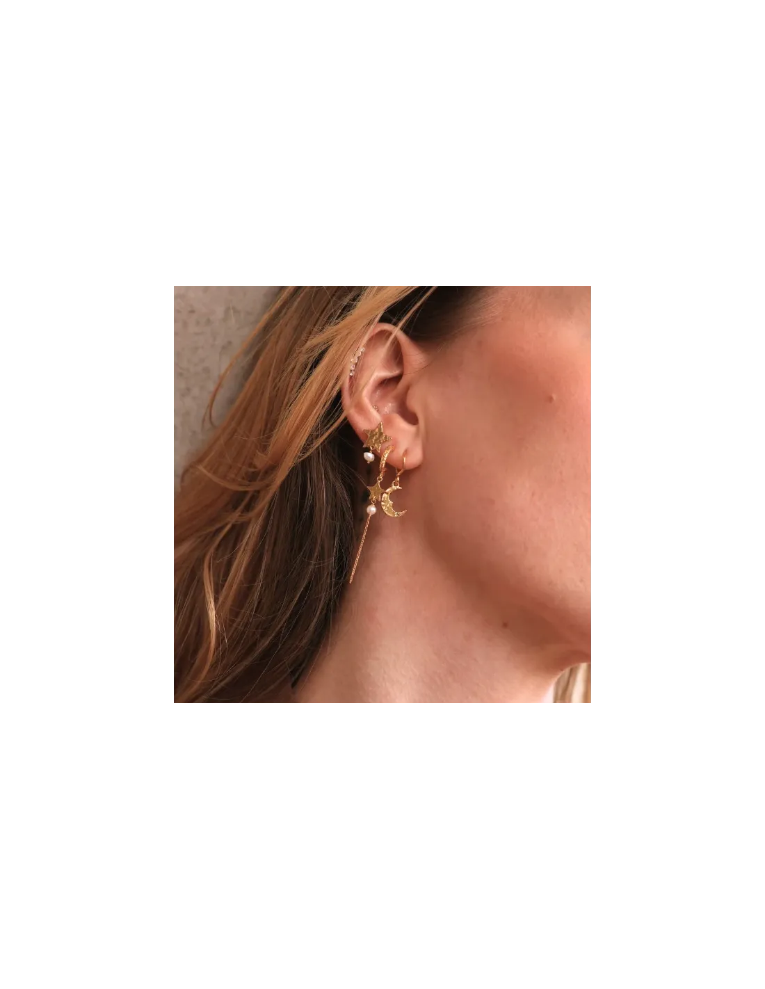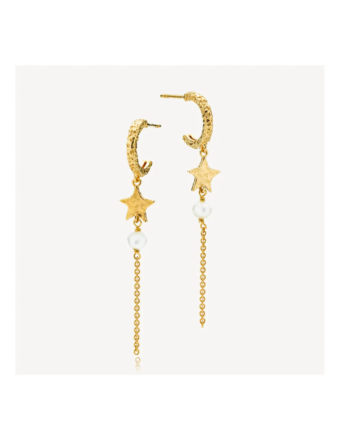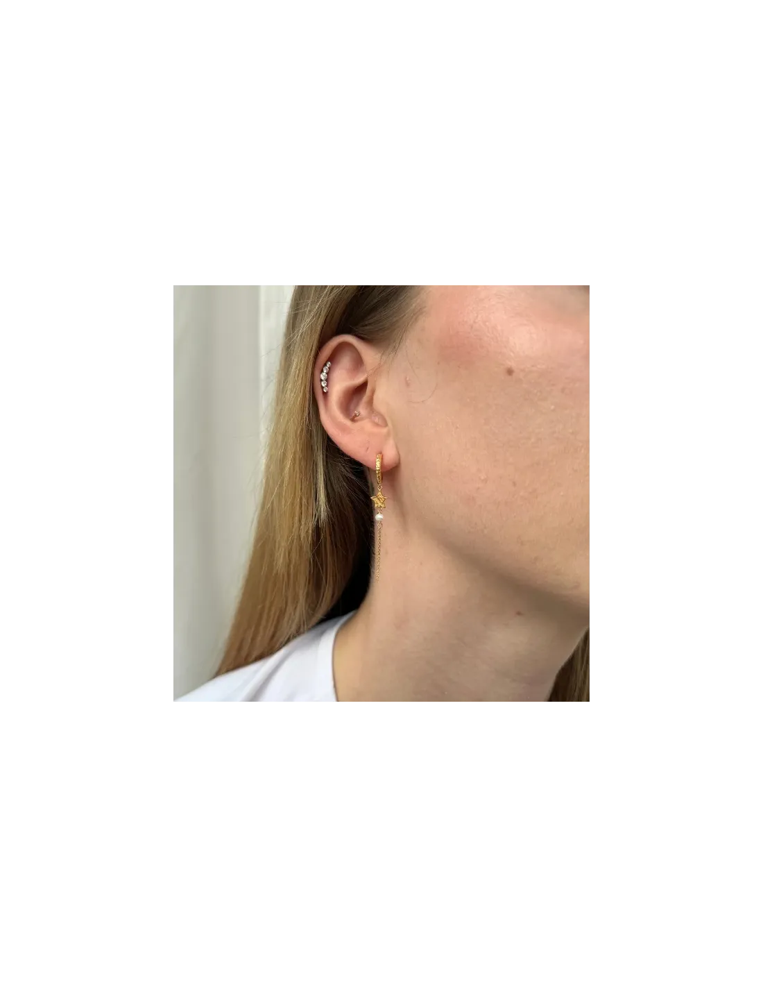 Skyla Øreringe Forgyldt fra Sistie kombinerer flere smukke detaljer i ét design. De små creoler har en hamret struktur, hvorfra en stjerne, en ferskvandsperle og en lang kæde hænger. Resultatet er et iøjnefaldende og feminint smykke, som giver bevægelse og liv til dit look. Perfekte til både hverdagsbrug og særlige lejligheder.