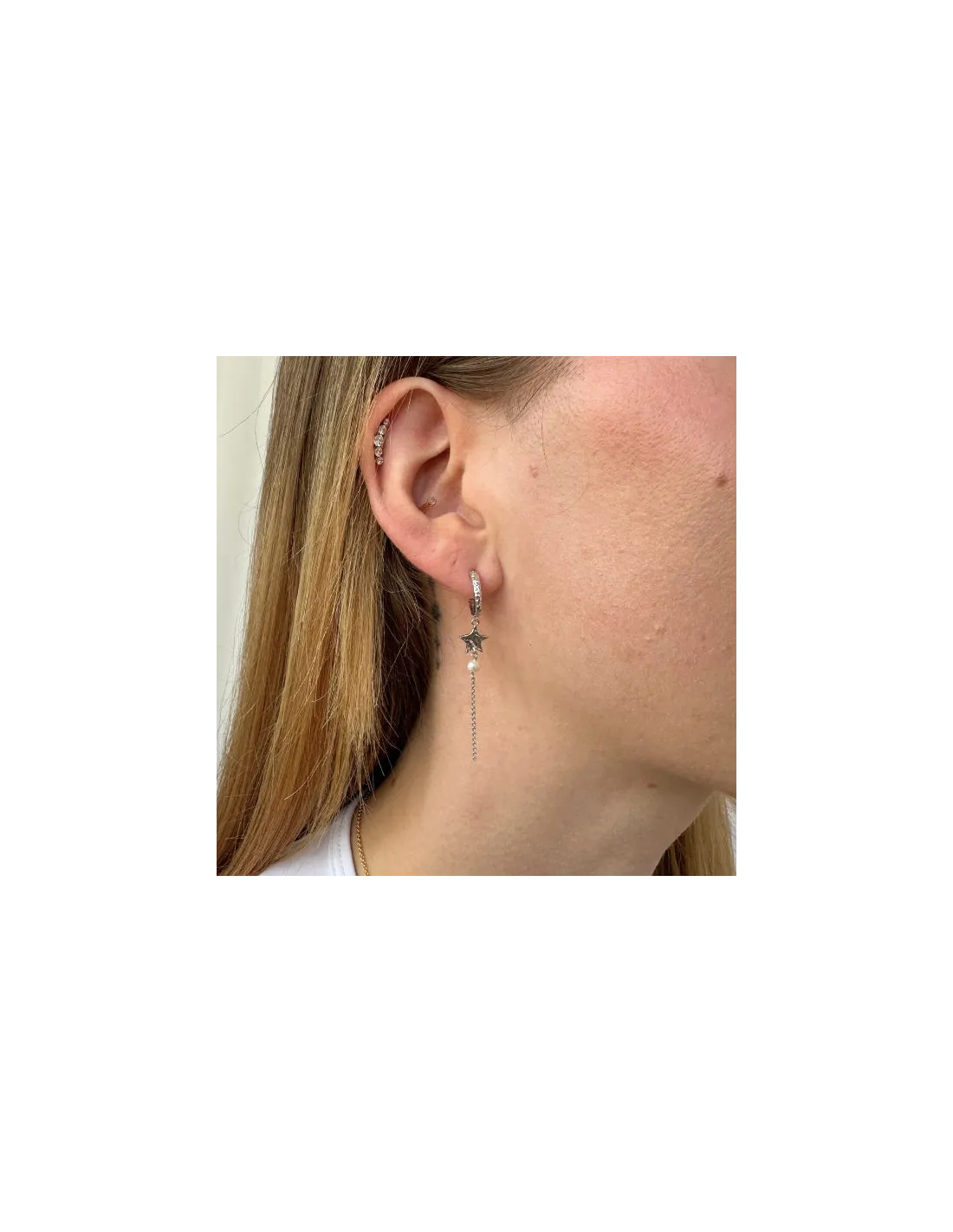 Skyla Øreringe Sølv fra Sistie er designet med små creoler i hamret sølvlook, hvorfra en stjerne, en ferskvandsperle og en lang kæde hænger. Øreringene har et let og elegant udtryk med naturlig bevægelse, der gør dem perfekte til både hverdag og festlige anledninger.