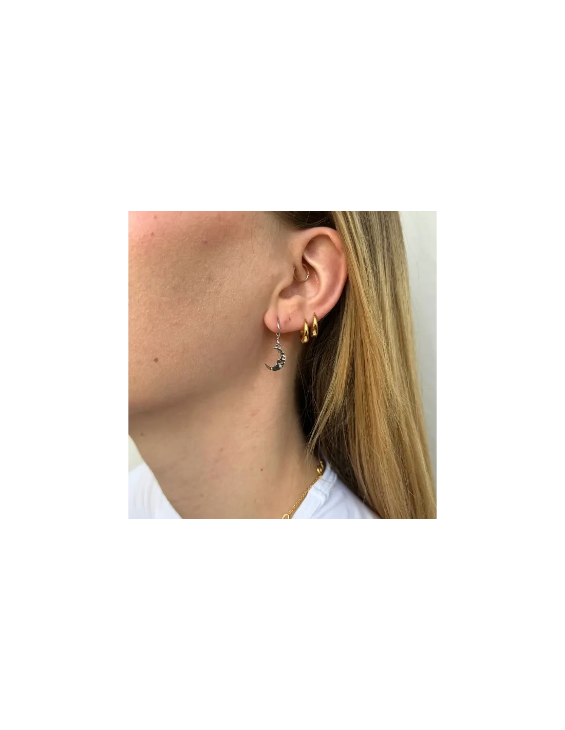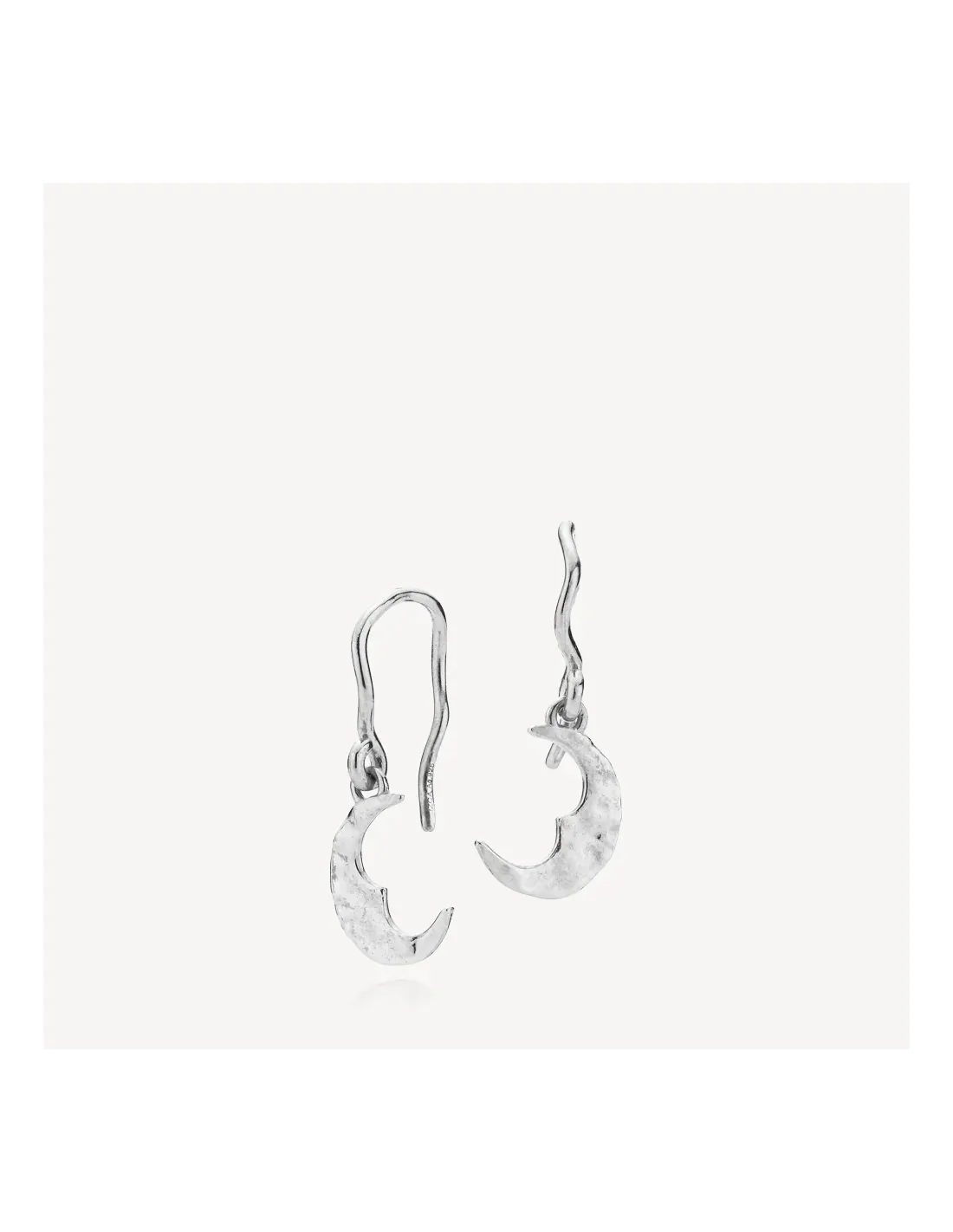 Skyla Øreringe Sølv fra Sistie er designet som små hængeøreringe med måneformede vedhæng. Smykket er udført i sølv og bæres med krog, hvilket giver et let og naturligt udtryk. Den hamrede overflade fremhæver detaljerne og gør hver ørering unik. Perfekte til både hverdag og særlige anledninger.