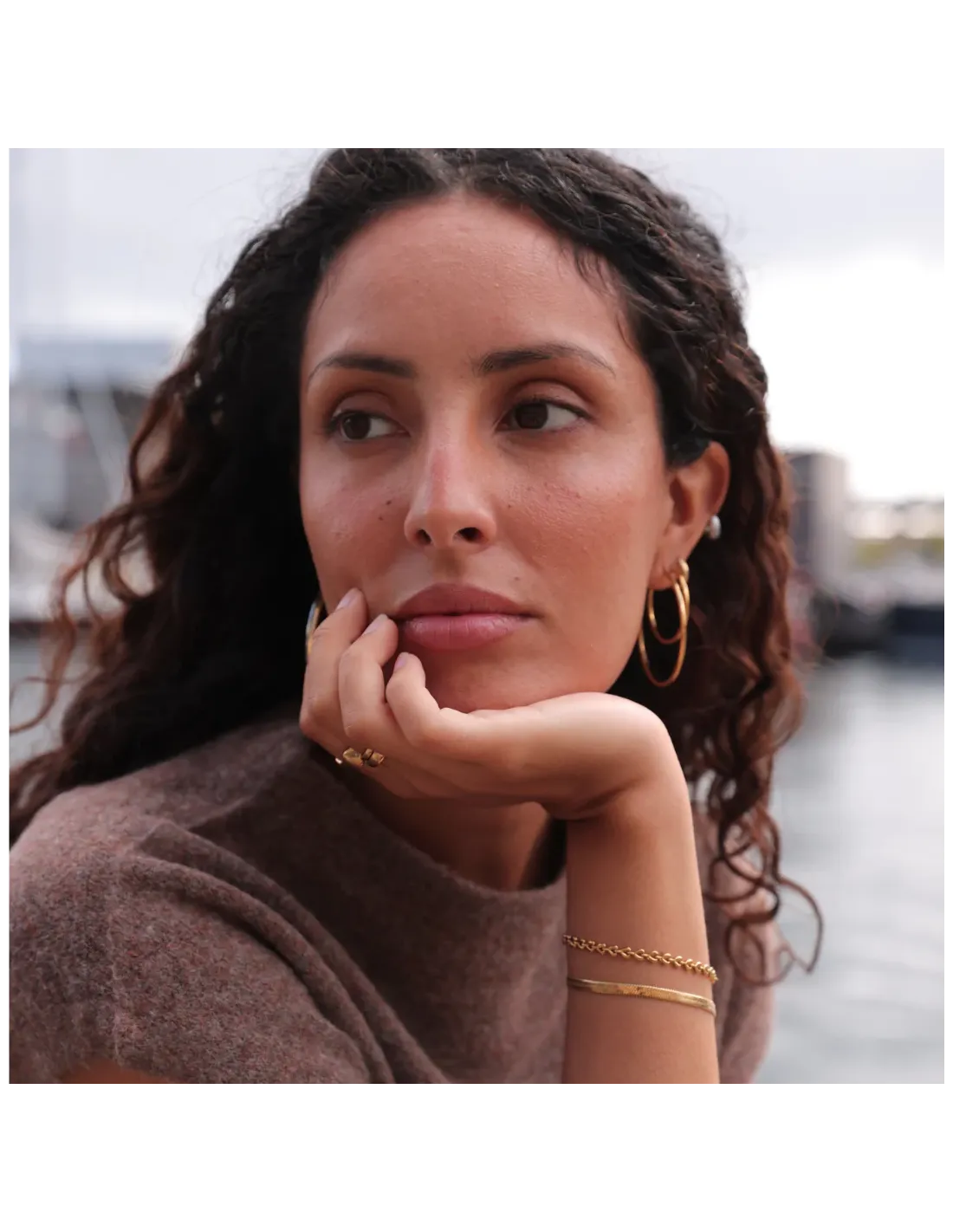 Alle smykker er lavet i genanvendt stainless steel og belagt med ekstra holdbar PVD-coating, som sikrer lang levetid – også i vand. De tåler både klor, saltvand og daglig brug uden at miste glans.