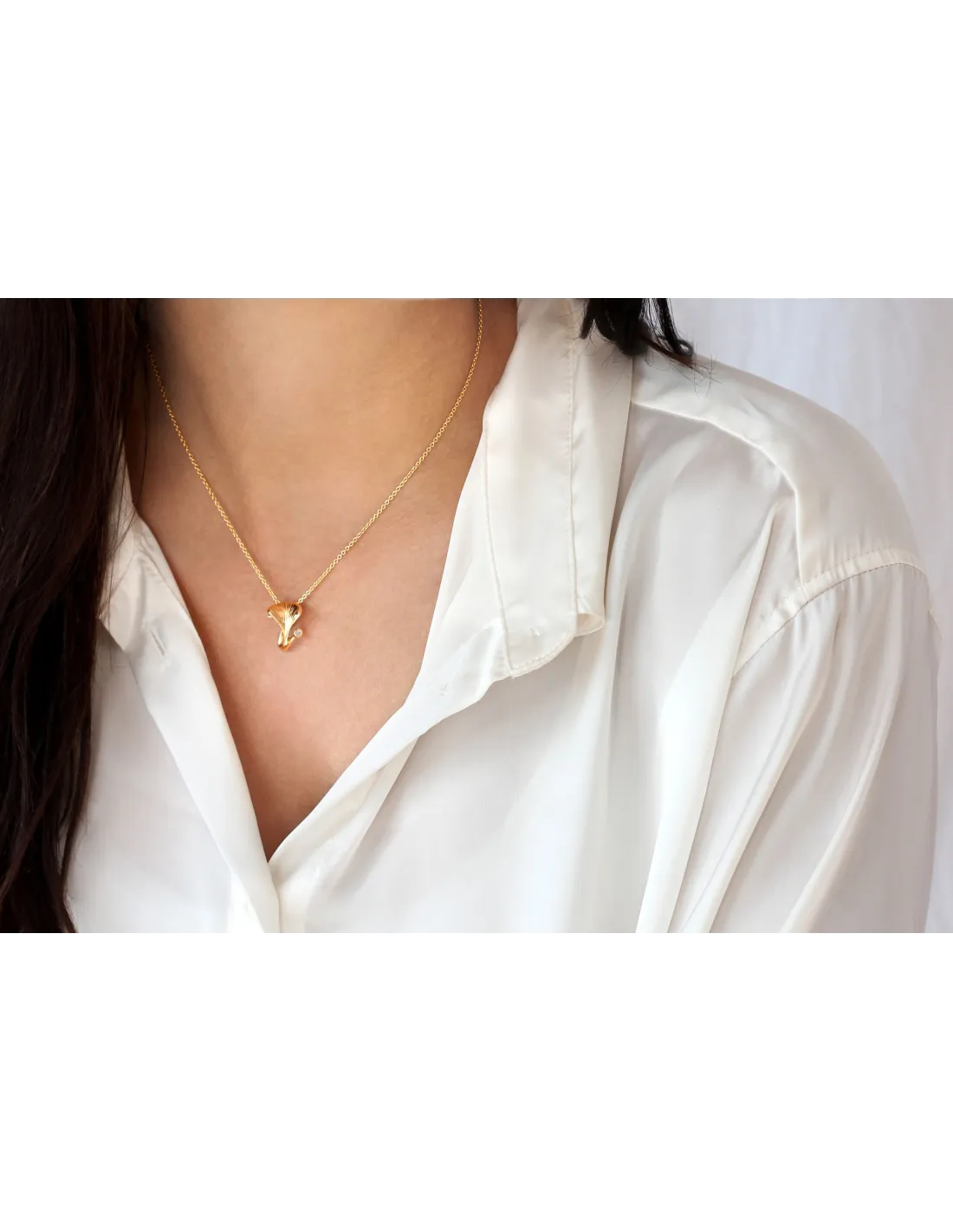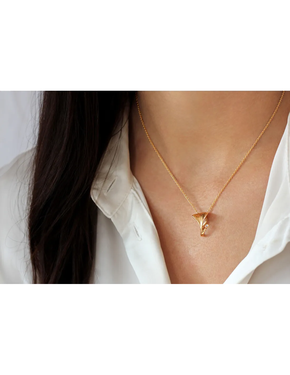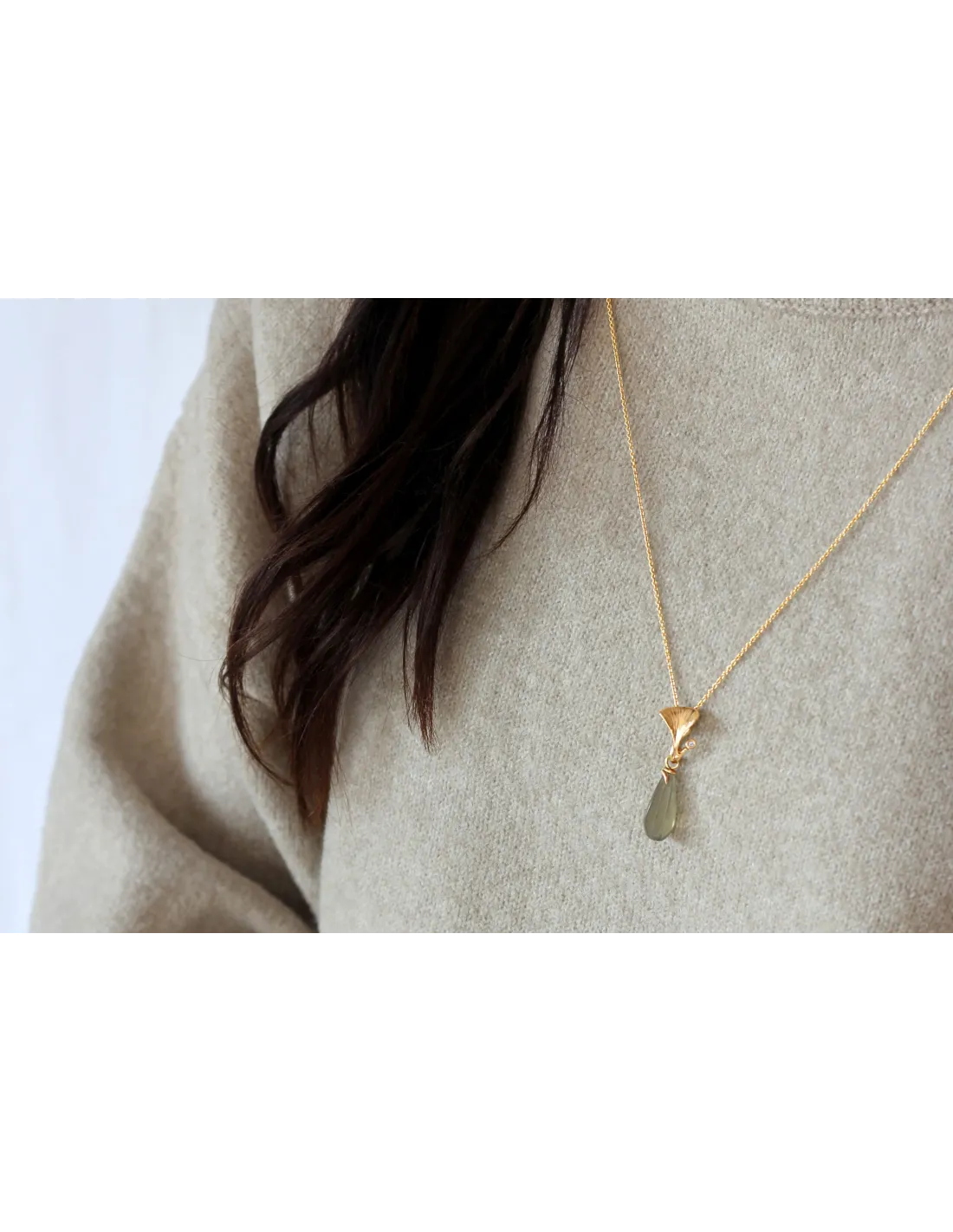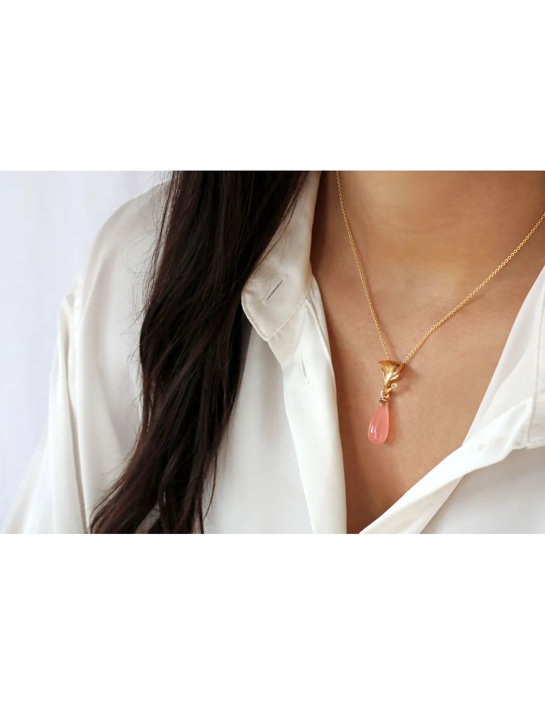 Vedhænget er god i både en kort og en lang kæde. Det kan bæres alene eller der kan sættes en Ophelia dråbe på. Den skæve snørkel bagpå er nemlig både en del af designet, men fungere også som krog til ædelstensvedhængene der fås i flere forskellige farver.