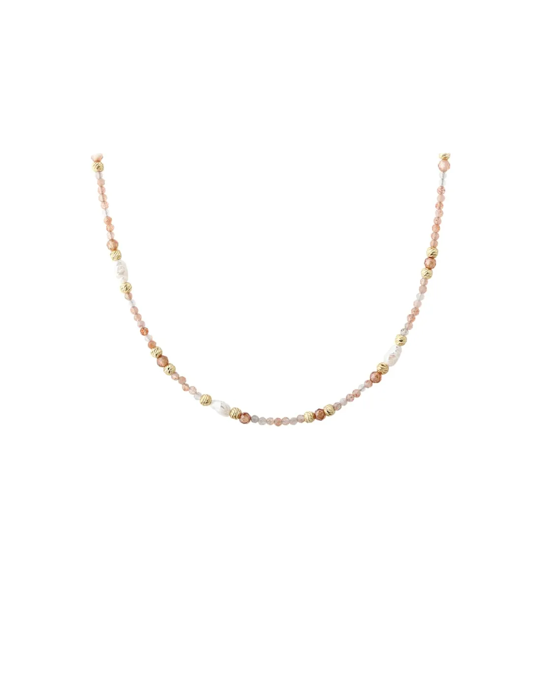 De delikate sunstone-perler bringer subtile nuancer af rosa og gyldent lys til designet, mens de hvide ferskvandsperler tilfører et klassisk og elegant touch. De små forgyldte detaljer skaber balance mellem stenene og understreger kædens håndlavede kvalitet.