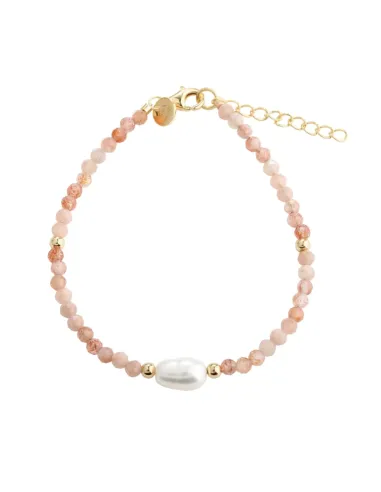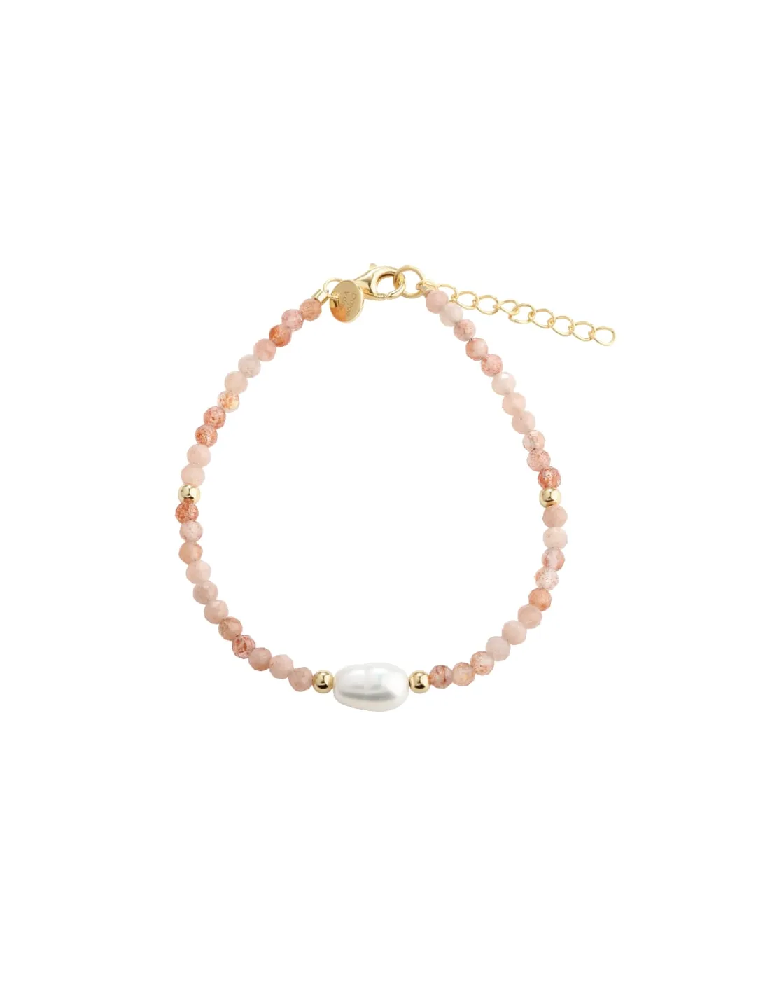 Forgyldt armbånd i 925 sterling sølv (14 kt. guld) med sunstone og ferskvandsperle. Længde: 17 + 3 cm. Elegant, naturligt og tidløst – perfekt til både hverdag og fest.