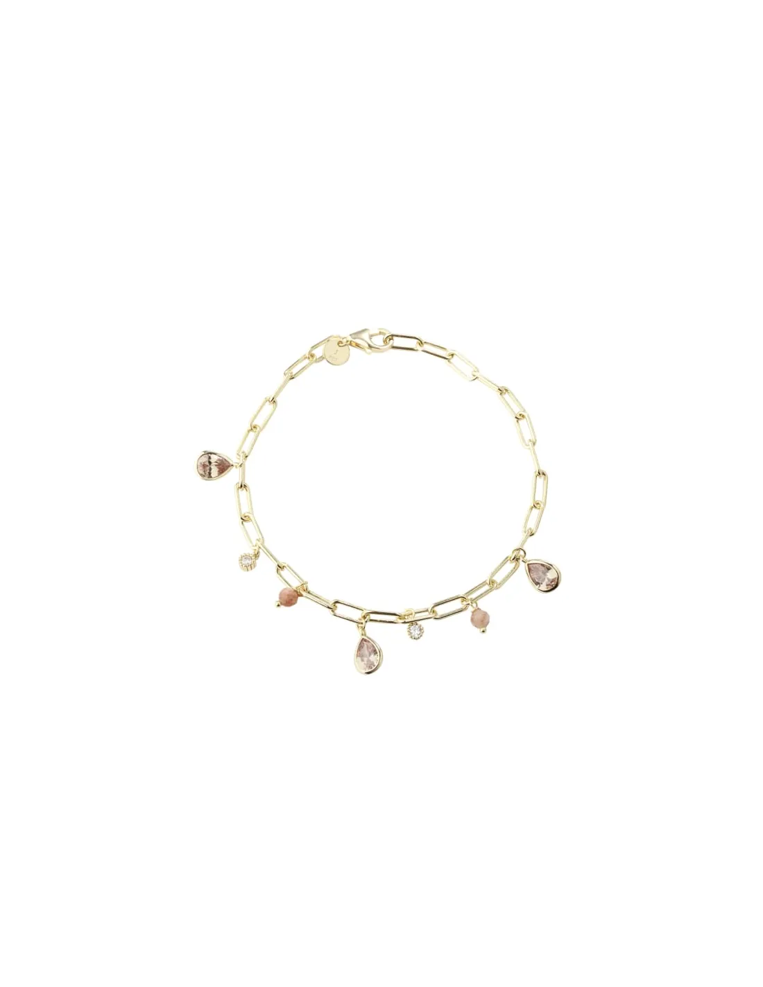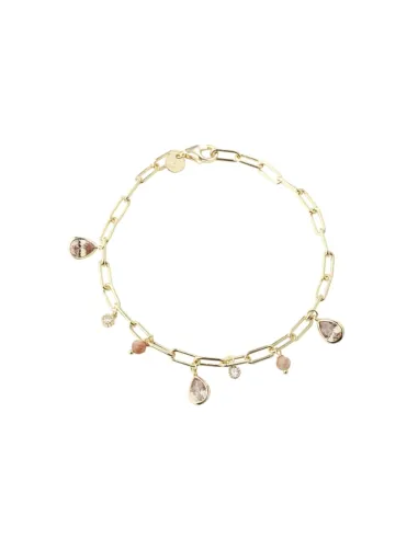 Forgyldt armbånd i 925 sterling sølv (14 kt. guld) med sunstone og zirkonia. Længde: 20,5 cm. Elegant kæde med fine vedhæng og smukt farvespil – ideel til både hverdag og fest.