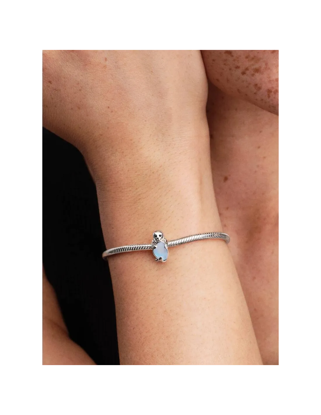 Oplev havets magi. Dette charm i sterlingsølv forestiller en sæl med funklende øjne af syntetiske krystaller. Sælen omfavner et isbjerg fremstillet af månestensiriserende glas. En lille påmindelse om at holde godt fast på det, der betyder noget.