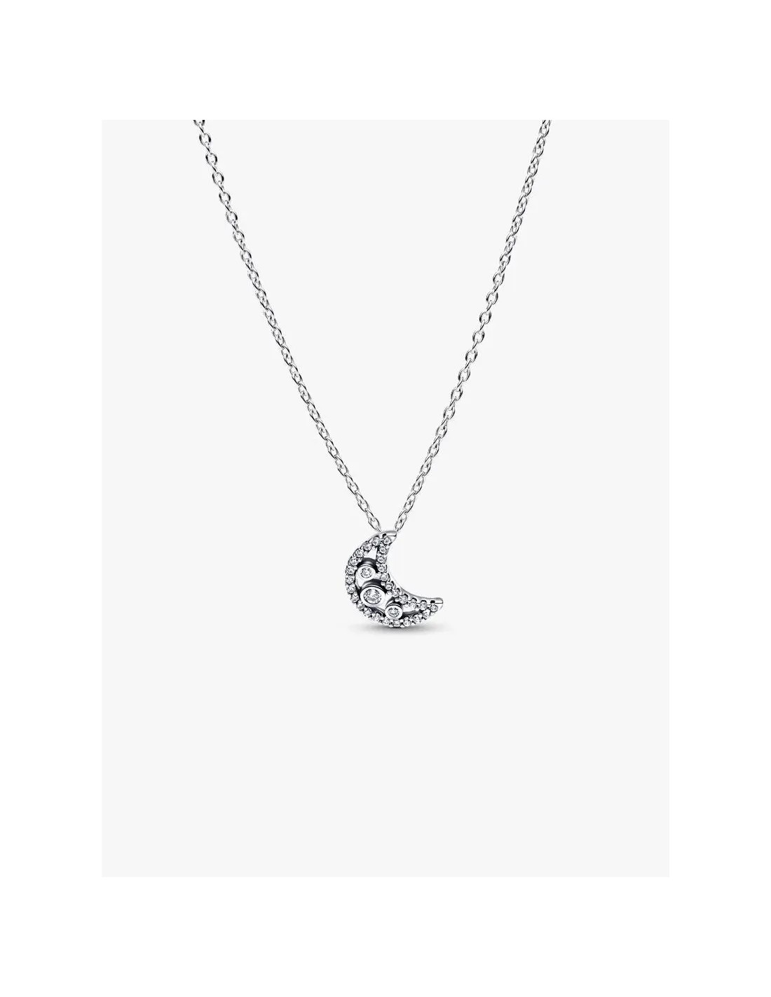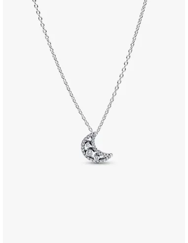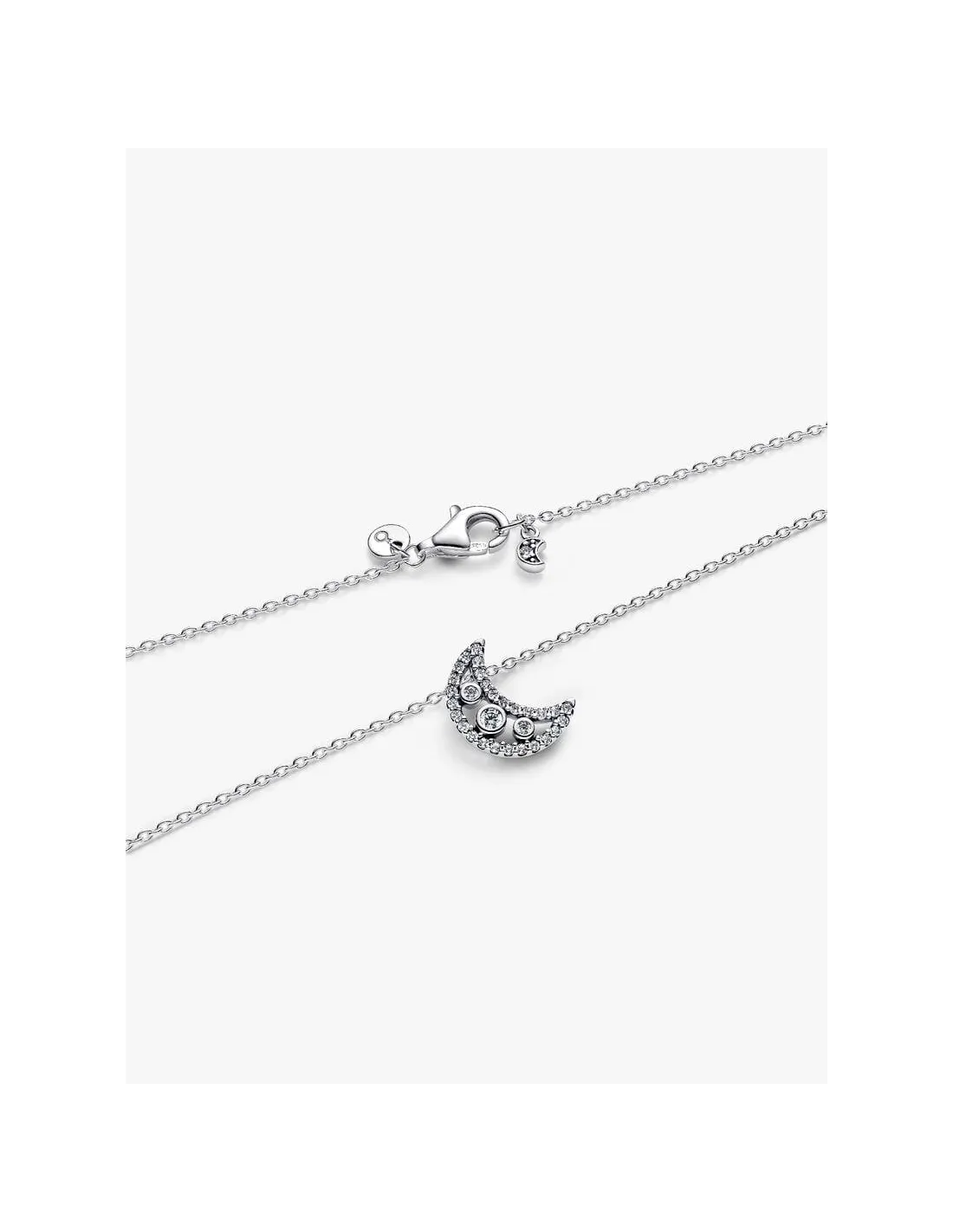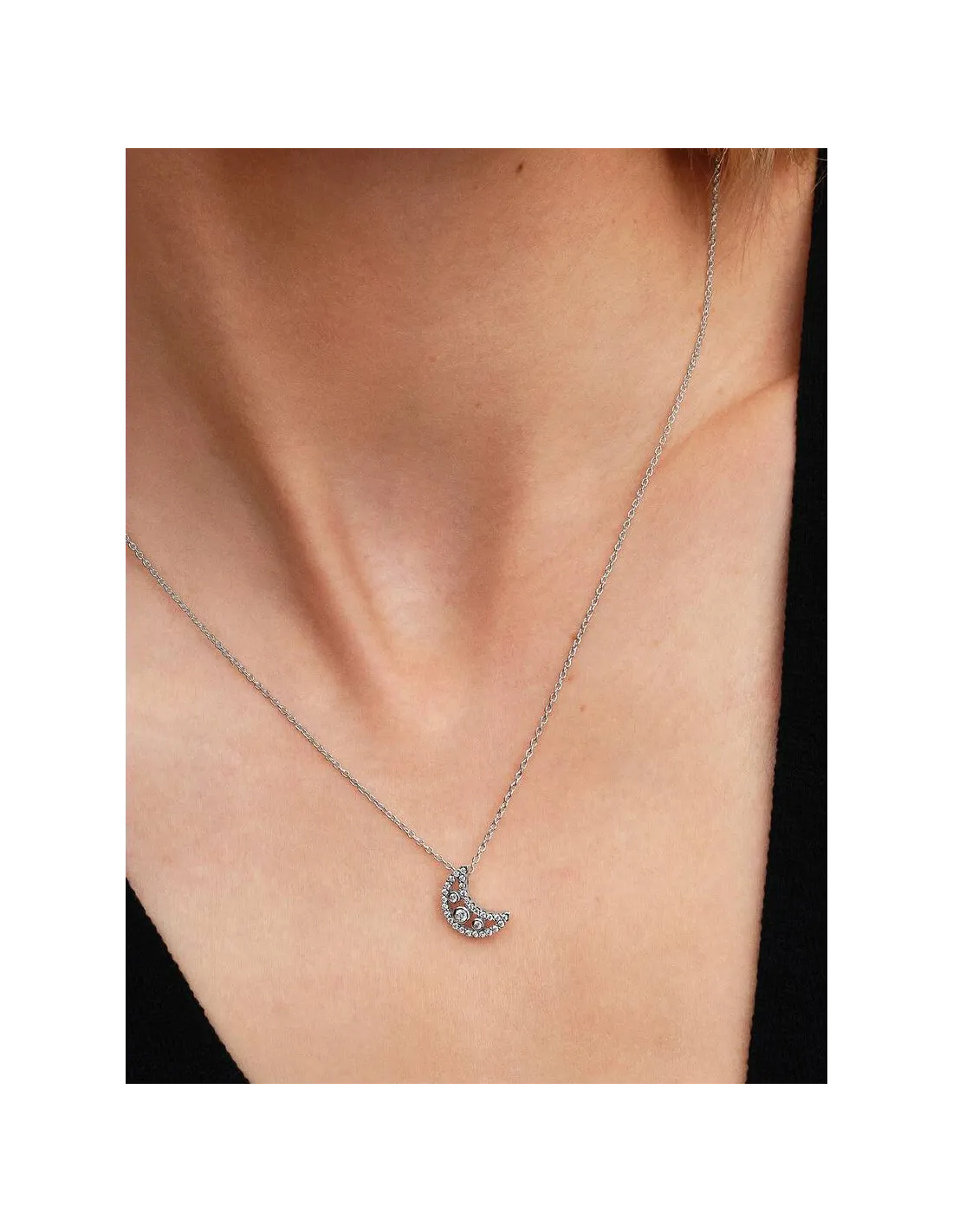 Bær nattehimlens vidunder. Denne halskæde i sterlingsølv består af en åben halvmåne, der er indfattet med funklende kubisk zirkonia. Hvis du kigger nærmere, vil du se, at der også hænger en miniversion på låsen.
