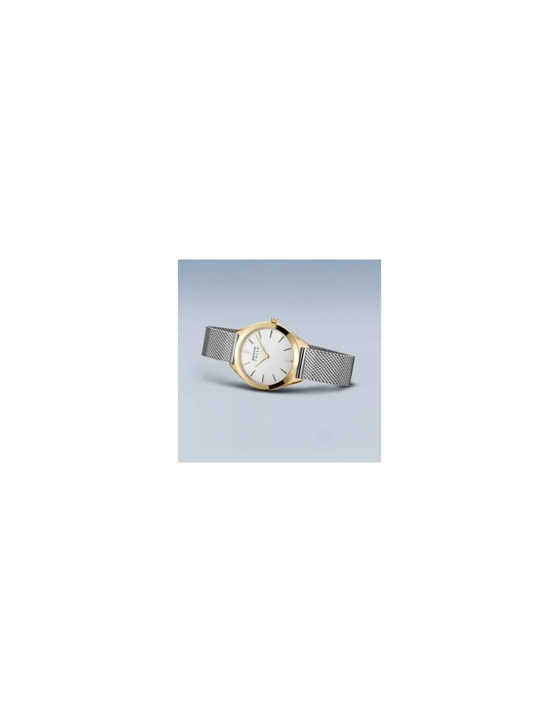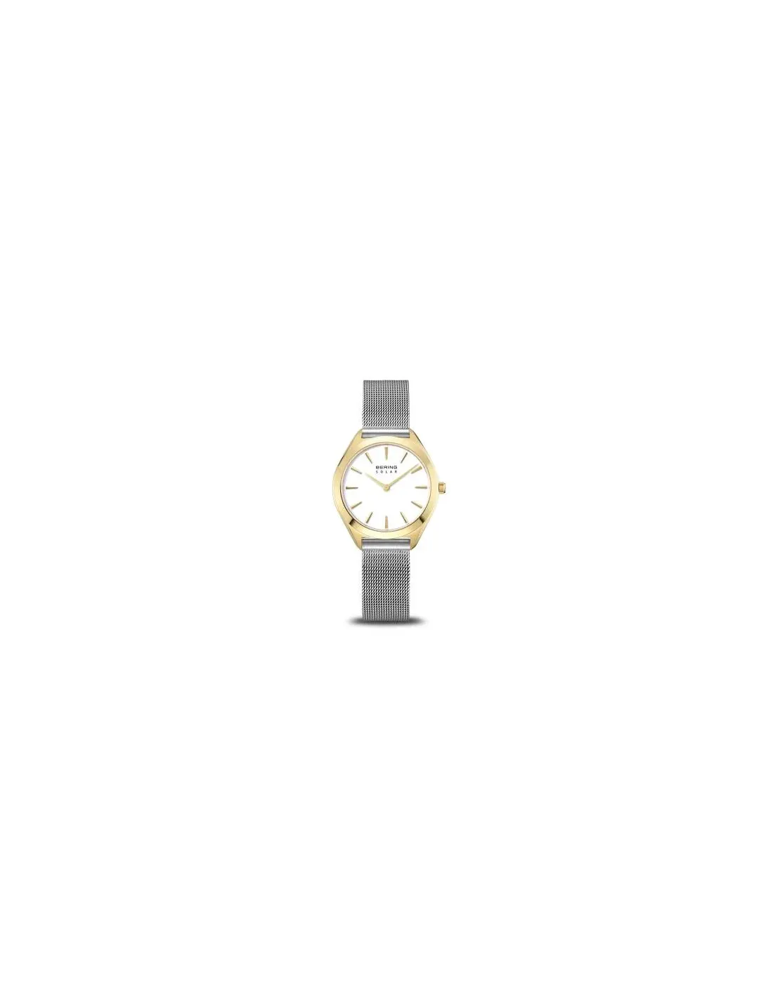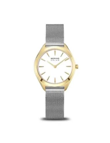 Dette dameur fra BERING Solar-kollektionen kombinerer klassisk elegance med moderne funktionalitet. Den hvide Sunray-urskive reflekterer lyset i fine nuancer, fremhævet af guldfarvede markeringer og visere – en kombination af renhed og varme.