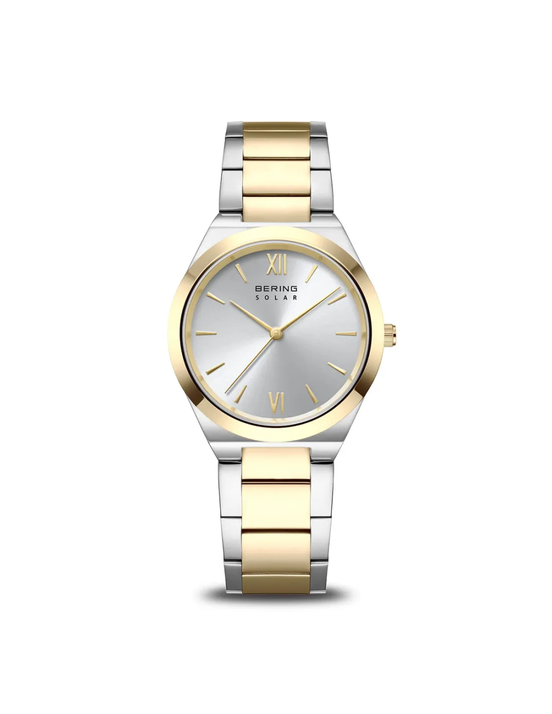 BERING dameuret 19932-710 kombinerer skandinavisk minimalisme med et strejf af gyldent luksus. Det elegante tofarvede design i sølv og guld giver uret et eksklusivt og harmonisk udtryk. Den sølvfarvede urskive med fine markeringer og romertal ved 12 og 6 o’clock udstråler klassisk elegance.