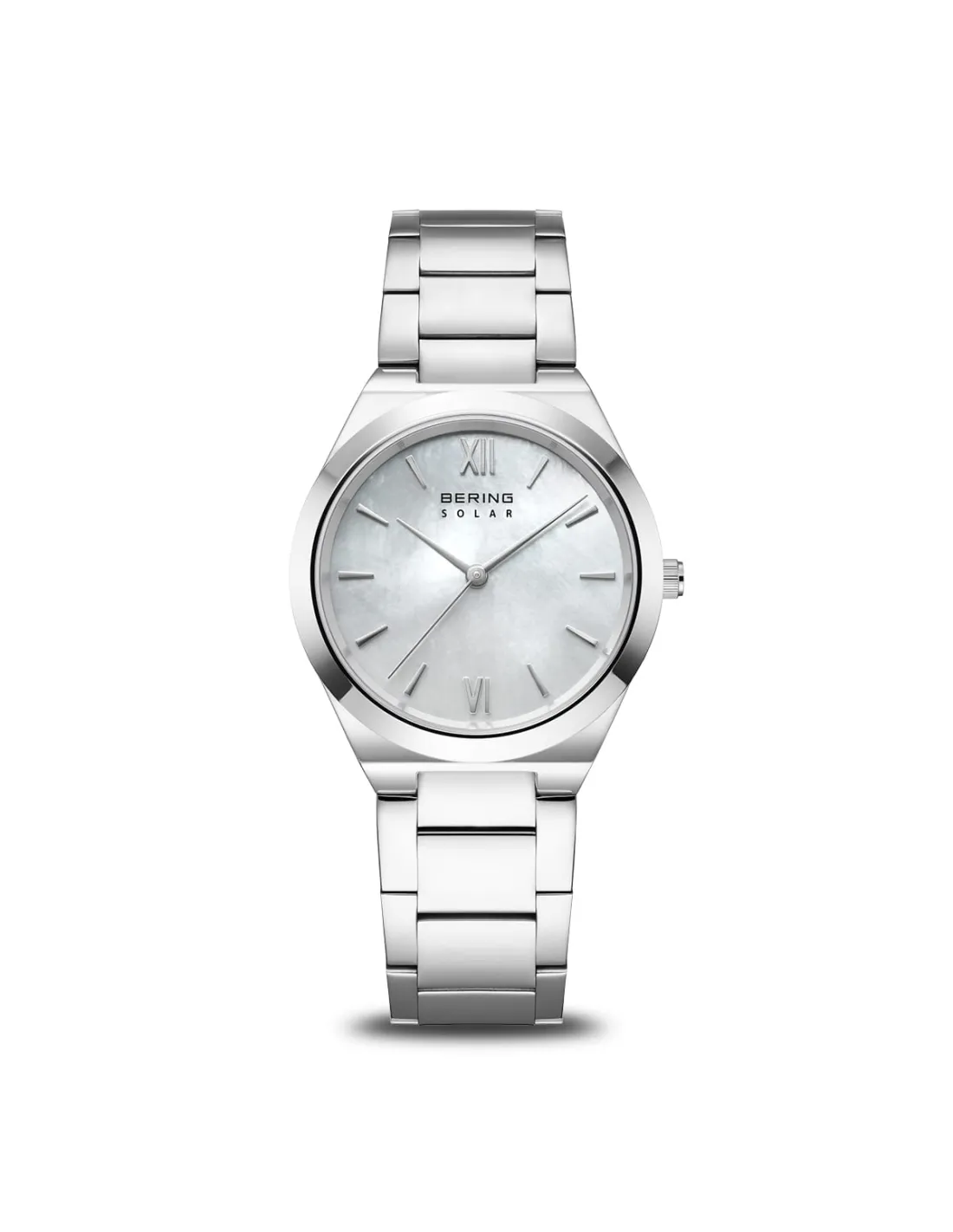BERING dameuret 19932-700 forener skandinavisk minimalisme med moderne elegance. Det sølvfarvede urkasse i rustfrit stål og det blankpolerede lænkearmbånd giver et stilrent og harmonisk udtryk. Det smukke perlemorsskive fanger lyset og reflekterer det i bløde nuancer, mens de slanke markeringer og romertal ved 12 og 6 understreger det klassiske design.