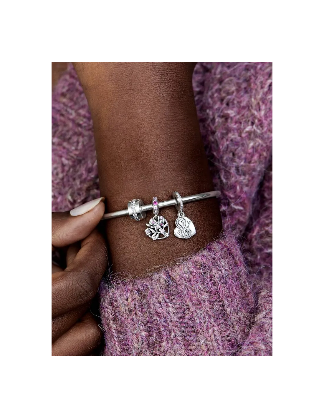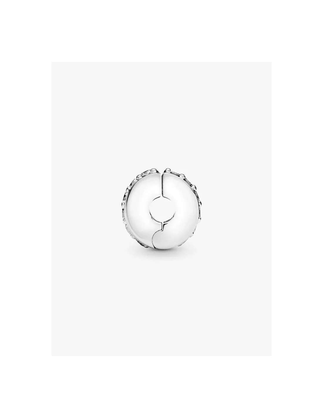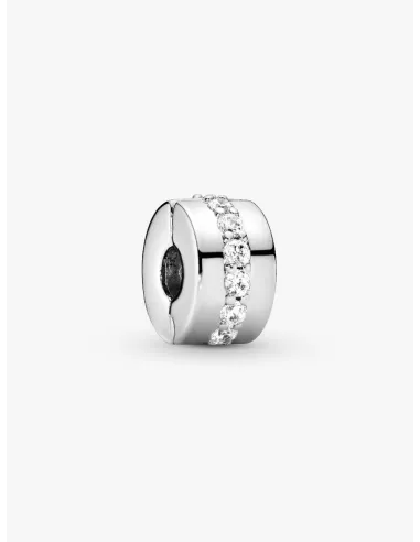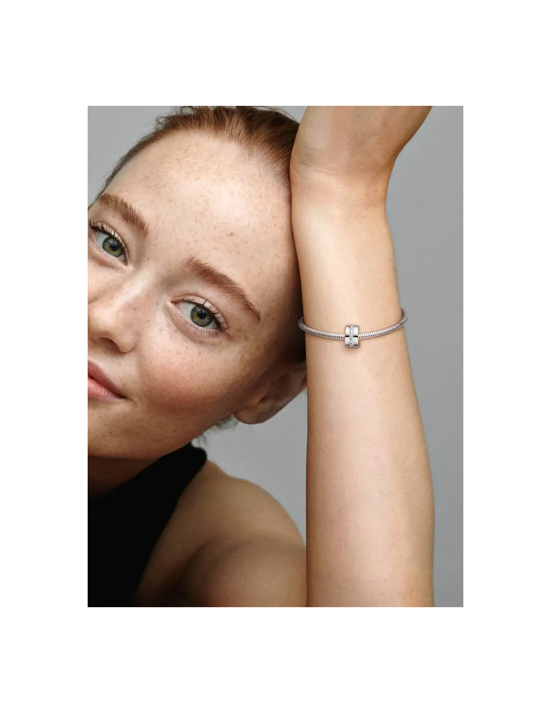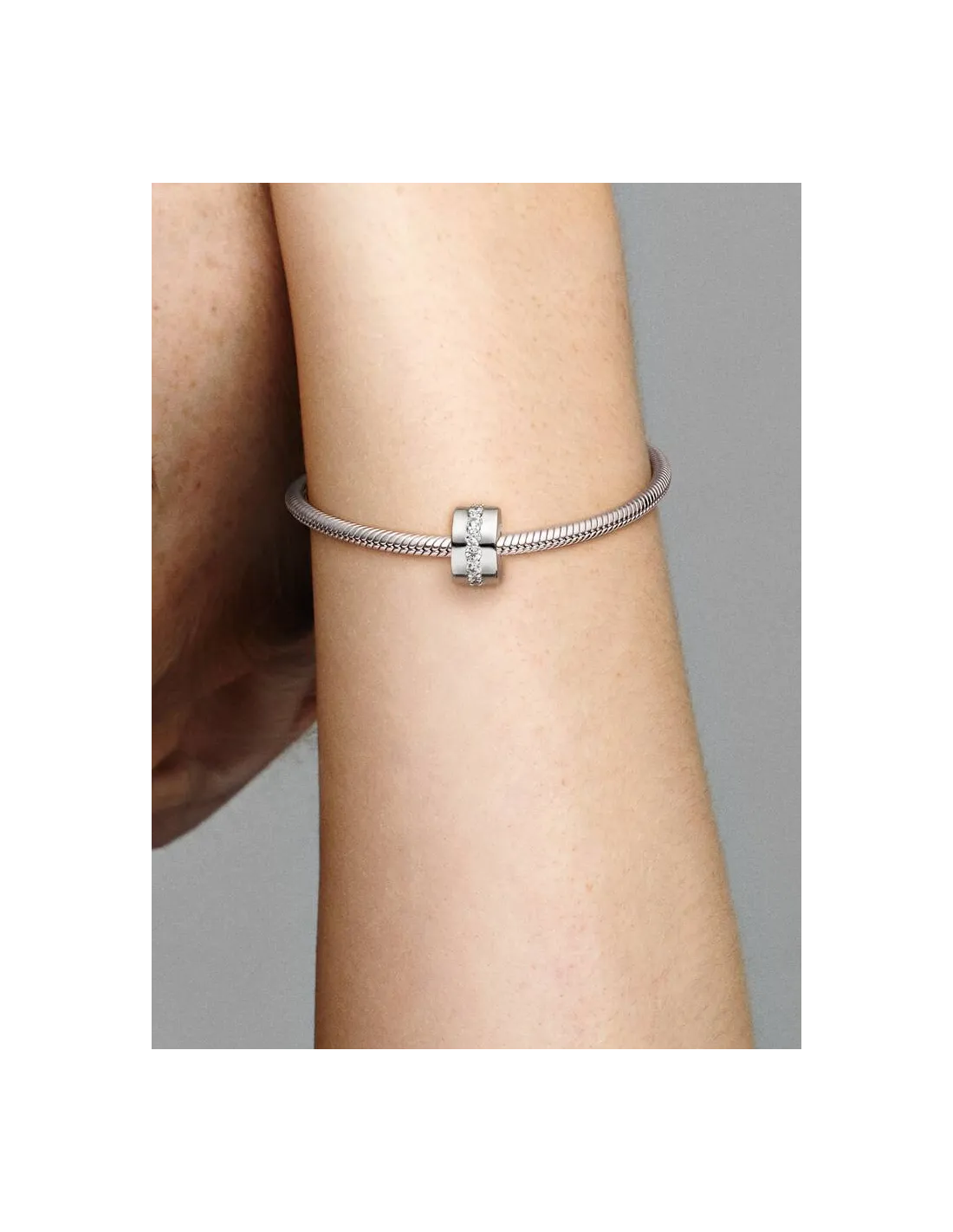 Med Pandora Moments-klemmeled kan du fordele dine charms jævnt ud på armbåndet og samtidig tilføre det både balance og skønhed. Dette klemmeled er fremstillet i sterlingsølv og dekoreret med en linje af kubisk zirkonia rundt langs midten. Føj et enkelt til din styling, eller sæt et på hver ende af dit armbånd som flotte detaljer. Dette klemmeled har ikke silikonegreb og vil derfor glide, hvis det ikke sidder på gevindstykker (to forhøjede charminddelere).