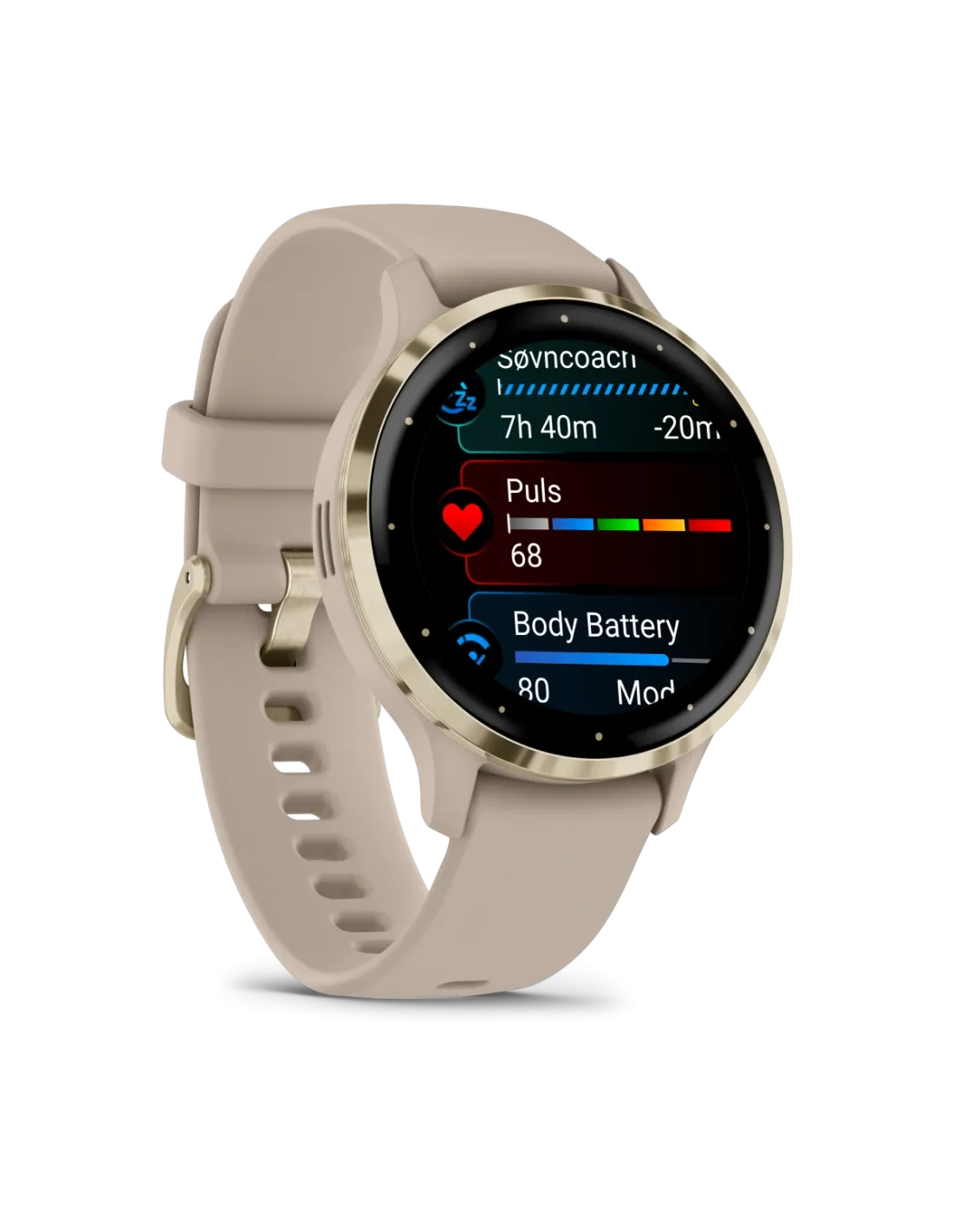 Venu 3S, der er specialbygget med avancerede sundheds- og træingsfunktioner og evnen til at foretage opkald og sende SMS’er1, er mere end blot et smartwatch — det er din personlige træner på håndleddet, der kan støtte alle dine mål.