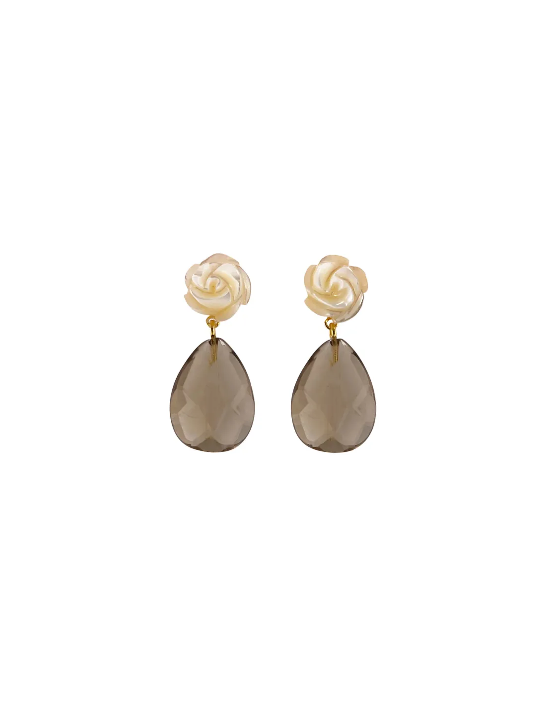 SUSANNE FRIIS BJØRNER | Ørering (stik), forgyldt sølv, perlemorsblomst 10 mm med røgkvarts dråbe facet ca. 3 cm