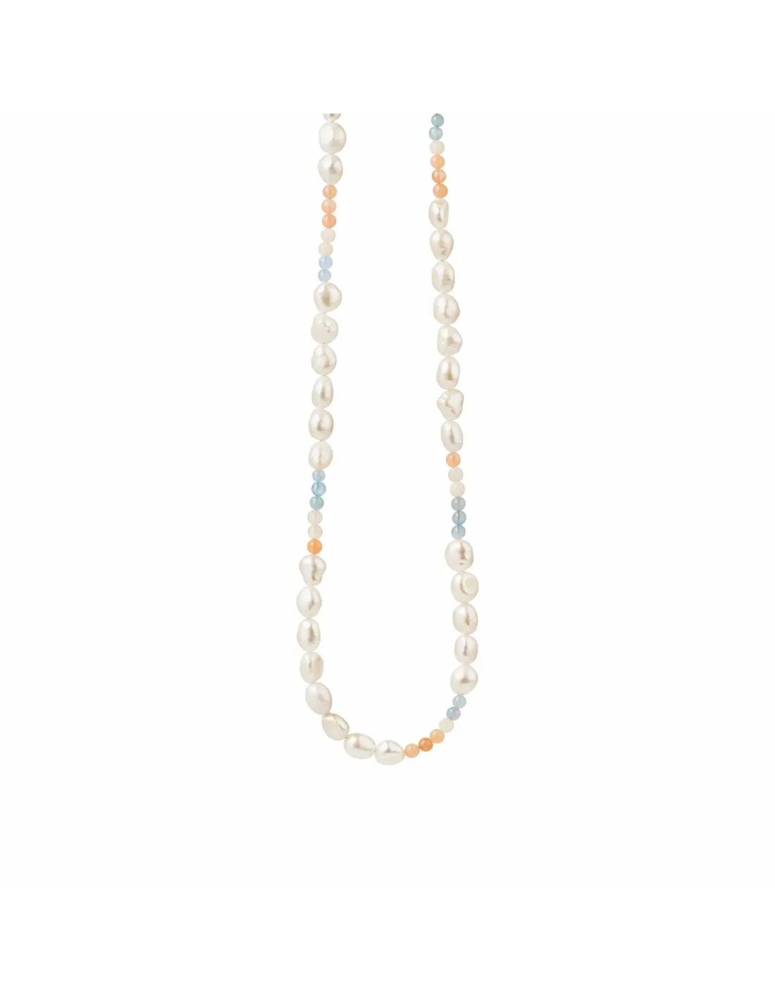 Halskæde 42-47 cm, forgyldt sølv, akvamarin, hvid månesten, peach månesten, hvid ferskvandsperle