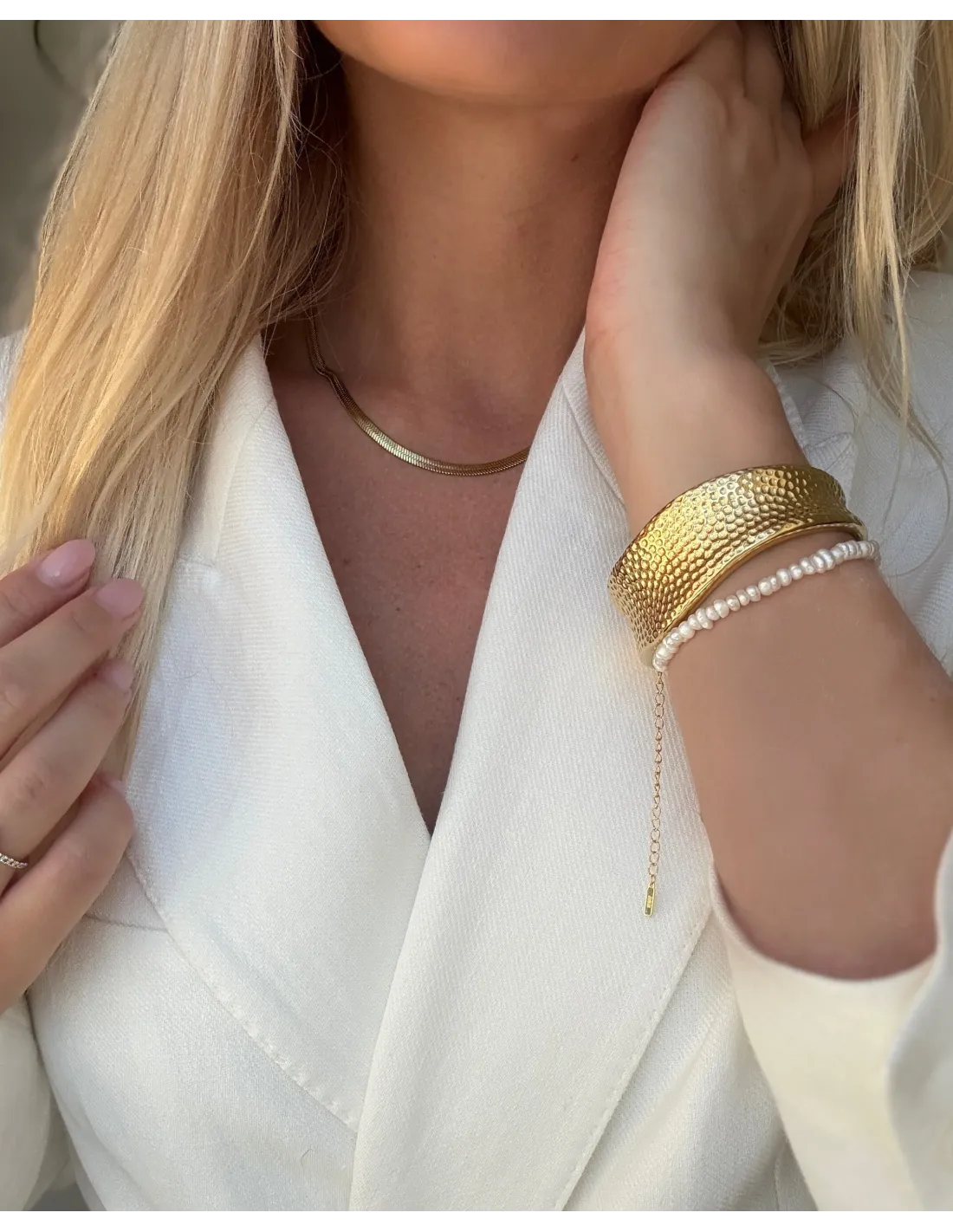 Vores Flat Snake Chain er fremstillet i vandfast stål, hvilket gør den perfekt til hverdagsbrug – du behøver ikke tage den af, når du går i bad, træner eller vasker hænder. Den flade, tætsluttede kæde ligger elegant mod huden og giver et sofistikeret, glansfuldt look, uanset om du bærer den alene eller styler den med andre kæder.