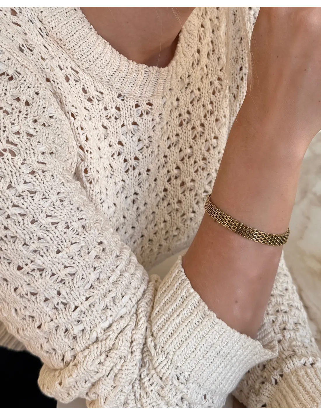 Vores Mesh Bracelet er fremstillet i vandfast stål – det betyder, at du trygt kan beholde det på, når du går i bad, vasker hænder eller træner. Armbåndets fine, flettede kædestruktur giver et elegant og sofistikeret udtryk, der fanger lyset på smukkeste vis. Brug det alene for et klassisk look eller kombiner det med andre armbånd for en mere personlig stil. Perfekt til hverdagsbrug – uden at du skal bekymre dig om slid.