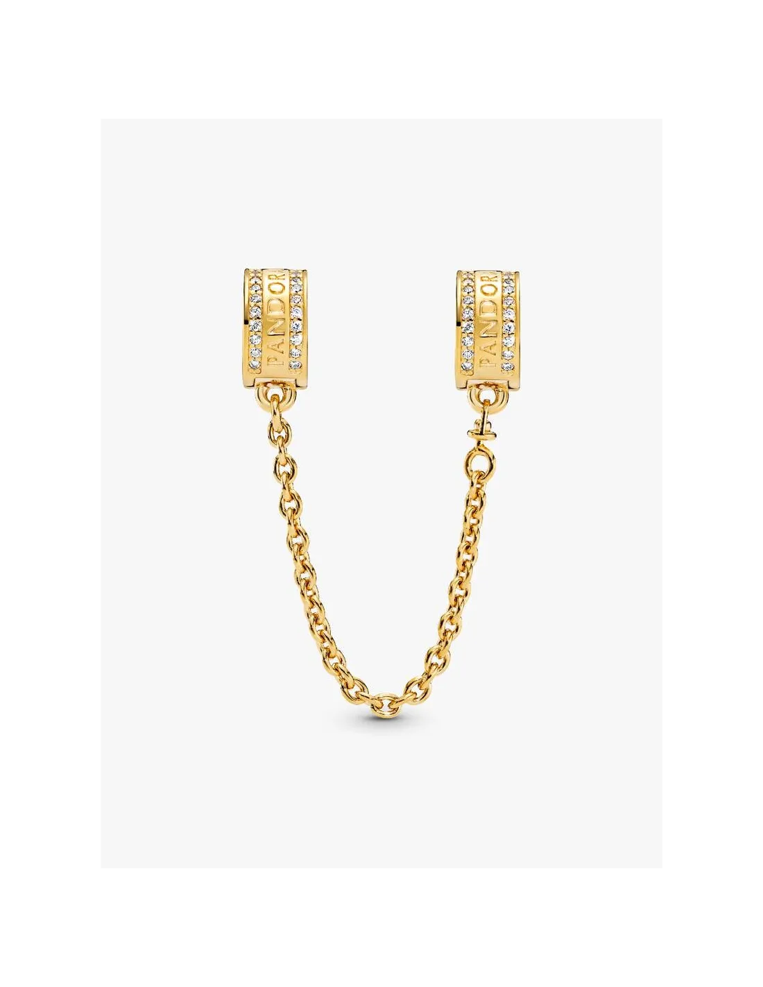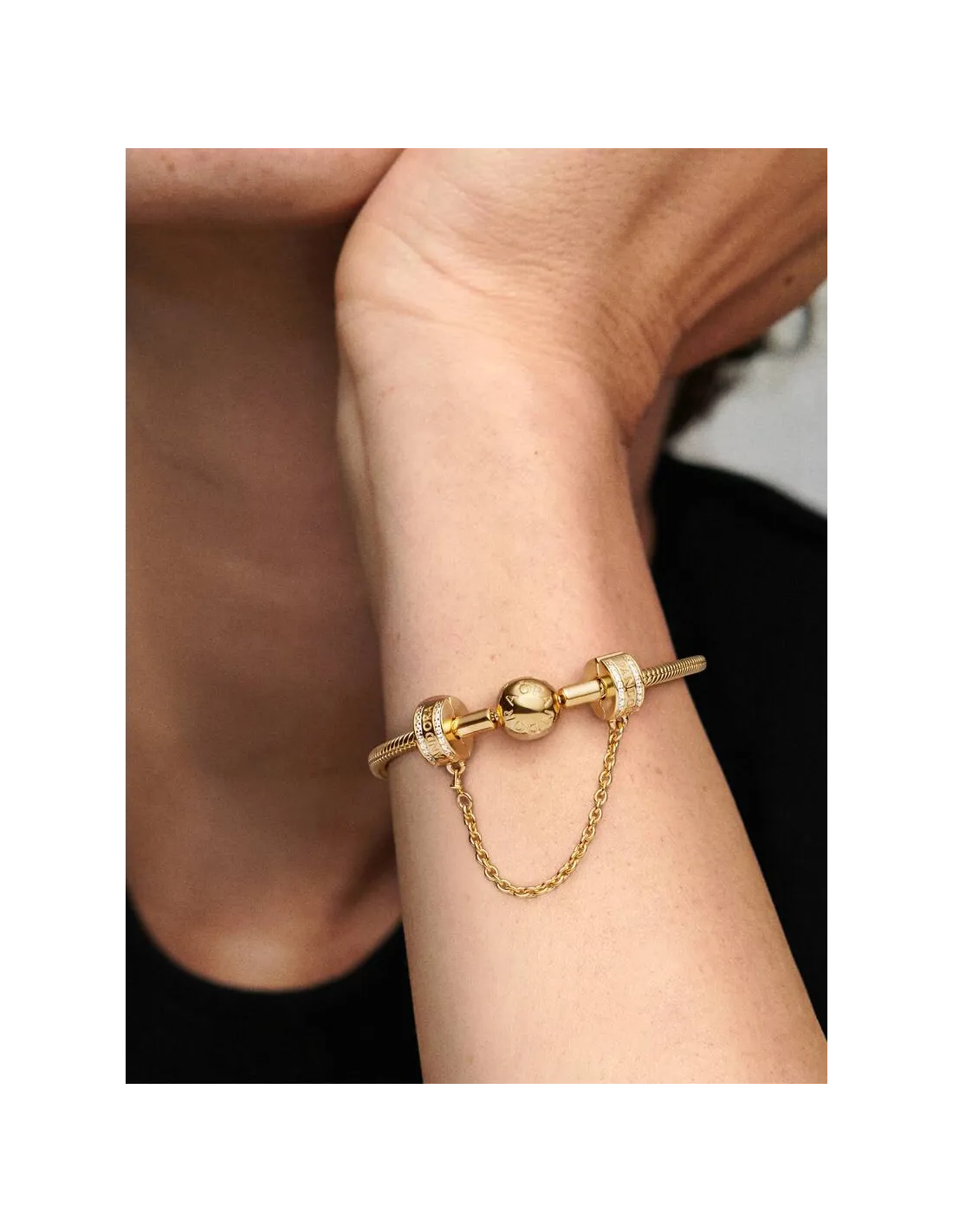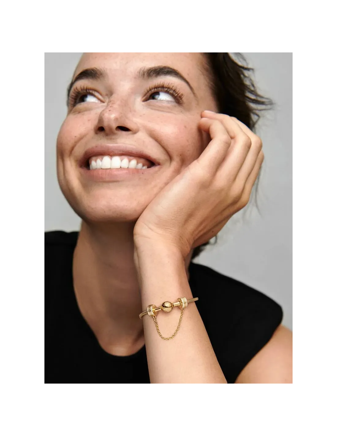 Dette glatte Pandora Logo Klemmeled med Sikkerhedskæde er fremstillet i vores glansfulde 14 kt. guldbelægning og dekoreret med Pandora logo og glitrende linjer af sten. Det er et tidløst smykke i en armbåndsstyling.