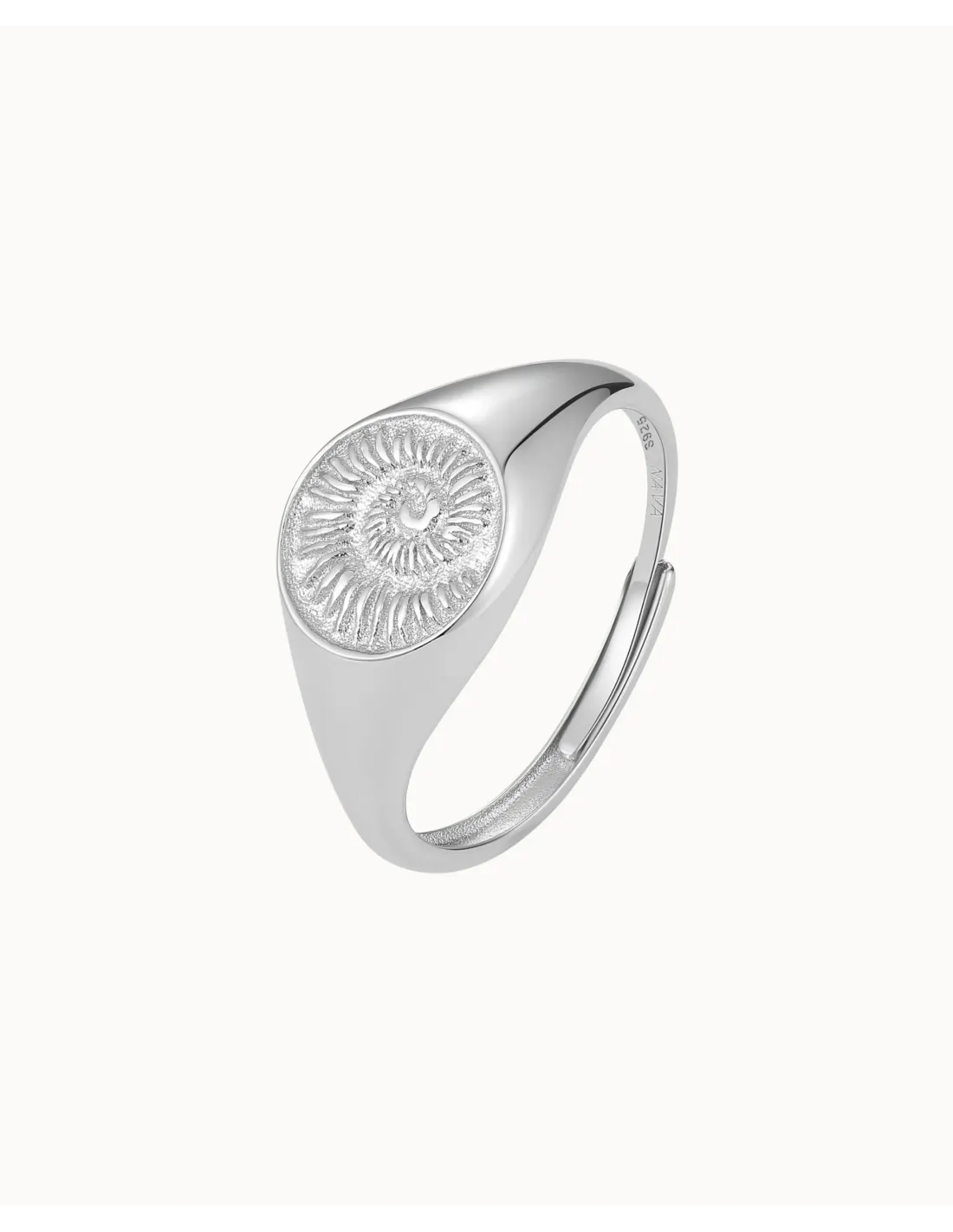 Shelly Ring er en moderne signetring med et detaljeret mønster, inspireret af fossile skaller og havets skjulte former. Det spiralformede relief i ringens centrum skaber et spændende spil mellem det matte og det blanke, og vækker associationer til strandfund og gamle tidevandsaflejringer.
