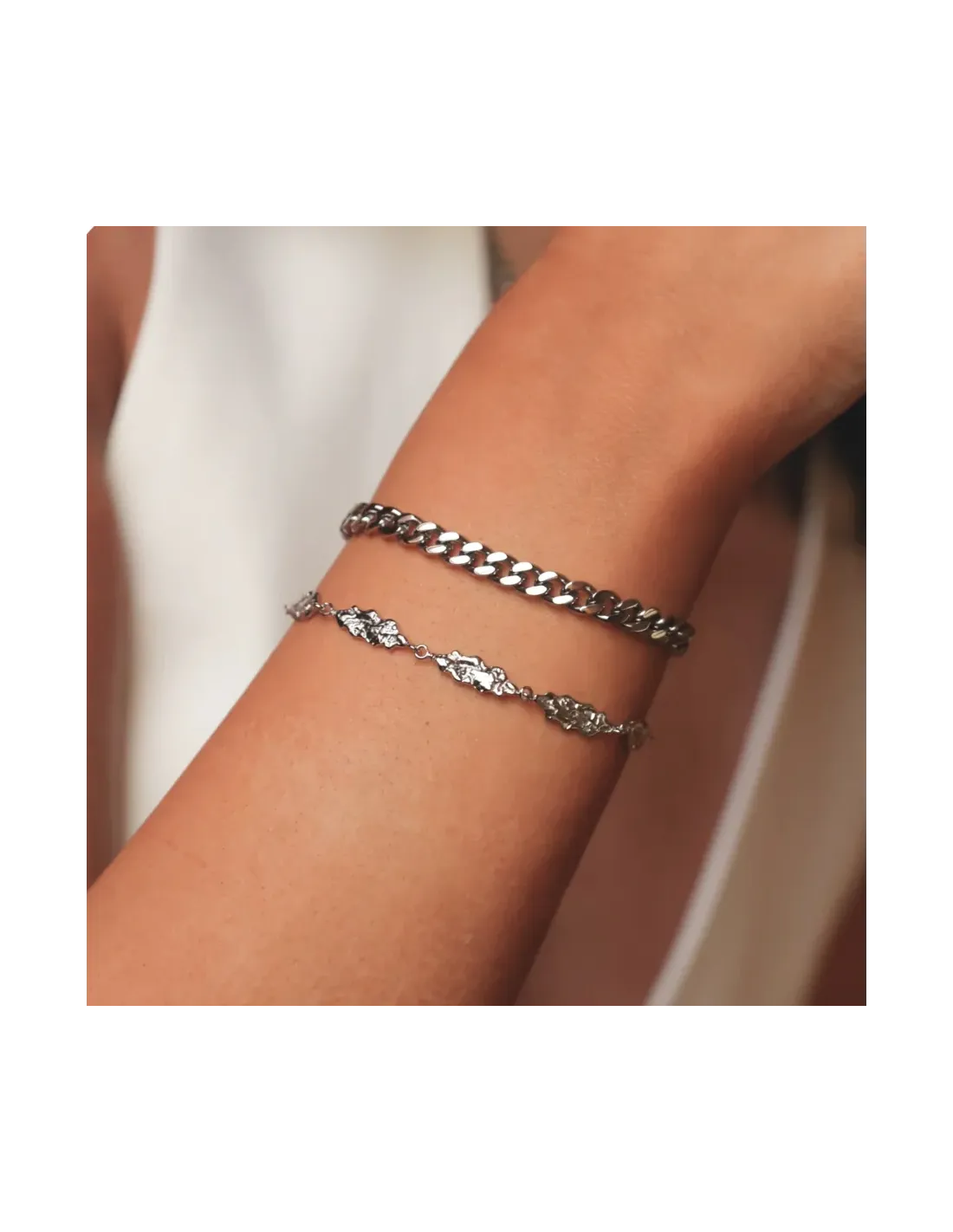 Alle smykker er lavet i genanvendt stainless steel og belagt med ekstra holdbar PVD-coating, som sikrer lang levetid – også i vand. De tåler både klor, saltvand og daglig brug uden at miste glans.